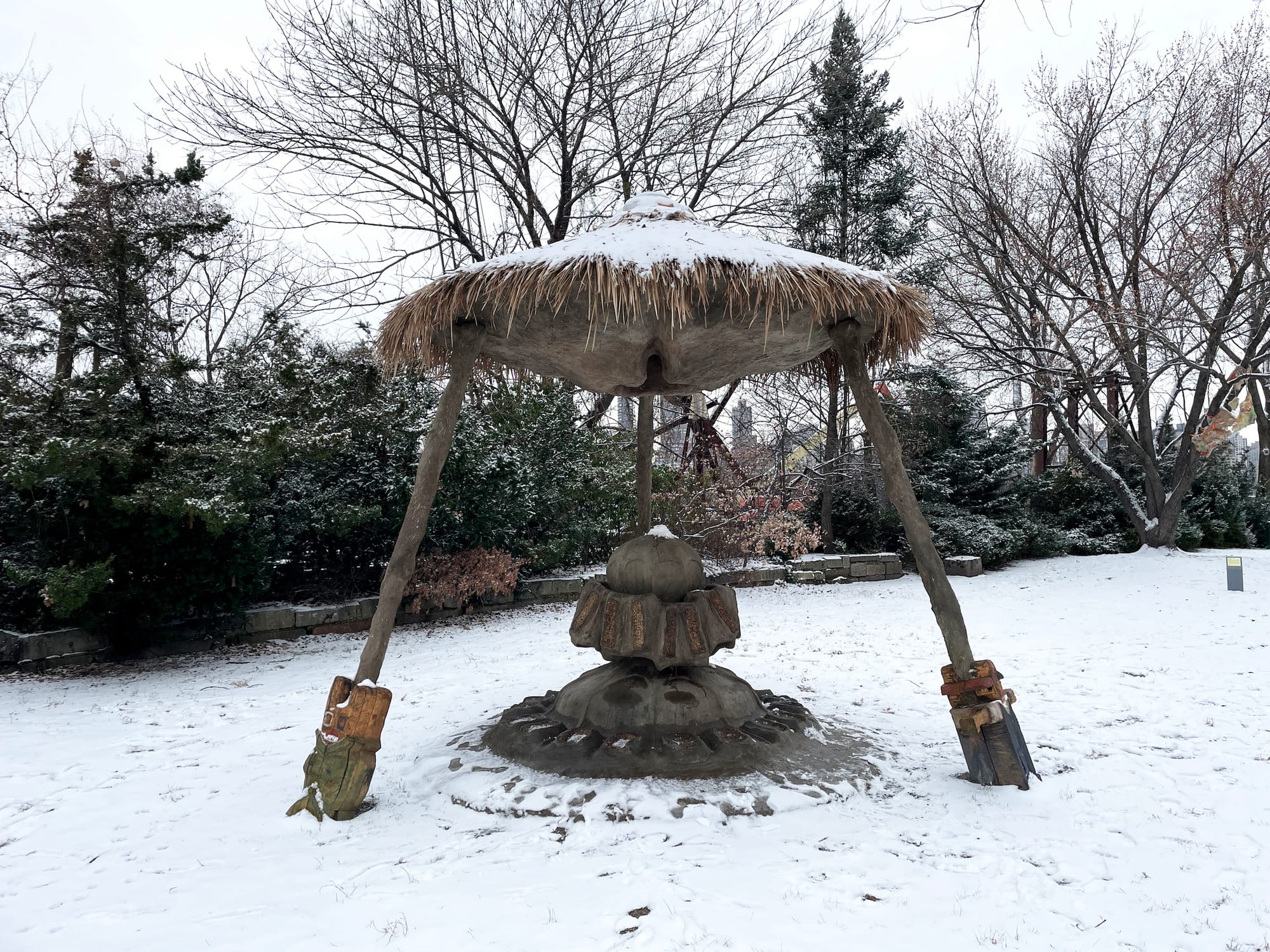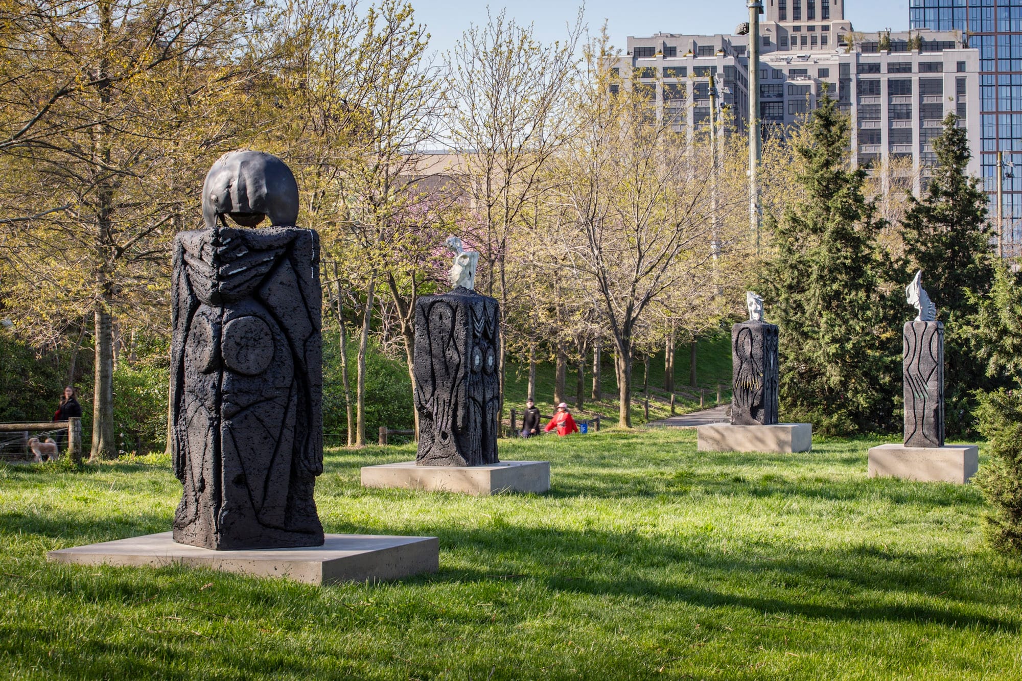 In Brooklyn Bridge Park, four massive bronze sculptures with organic material for heads (bones, horseshoe crabs) and plinth-like torsos rise from the earth atop cement blocks. These sculptures are sphinx-like in their awe-inspiring inscrutability, and recall Assyrian reliefs scored out of rough earth.
