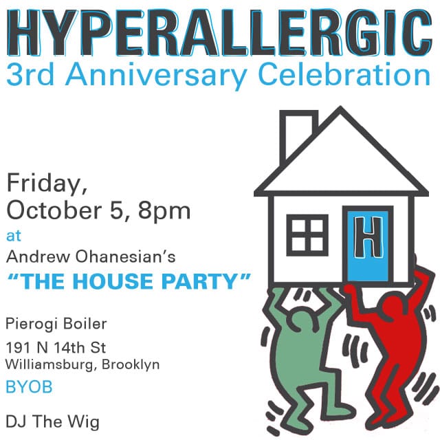 On Friday, October 5, starting at 8pm, Hyperallergic will be celebrating its Third Anniversary with a party at Andrew Ohanesian's "The House Party" in Pierogi Boiler … and you need to come!