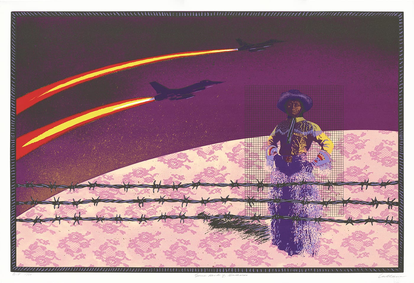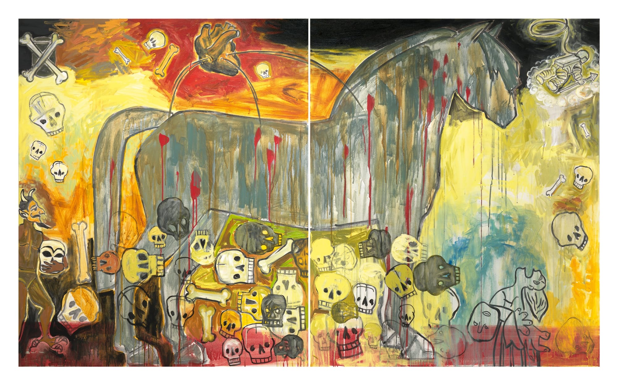 Jaune Quick-to-See Smith, “War Horse in Babylon” (2005), oil and acrylic on canvas, two panels, 60 inches x 100 inches overall (photo courtesy the artist and Garth Greenan Gallery, New York; Forge Project Collection, traditional lands of the Muh-he-con-ne-ok)