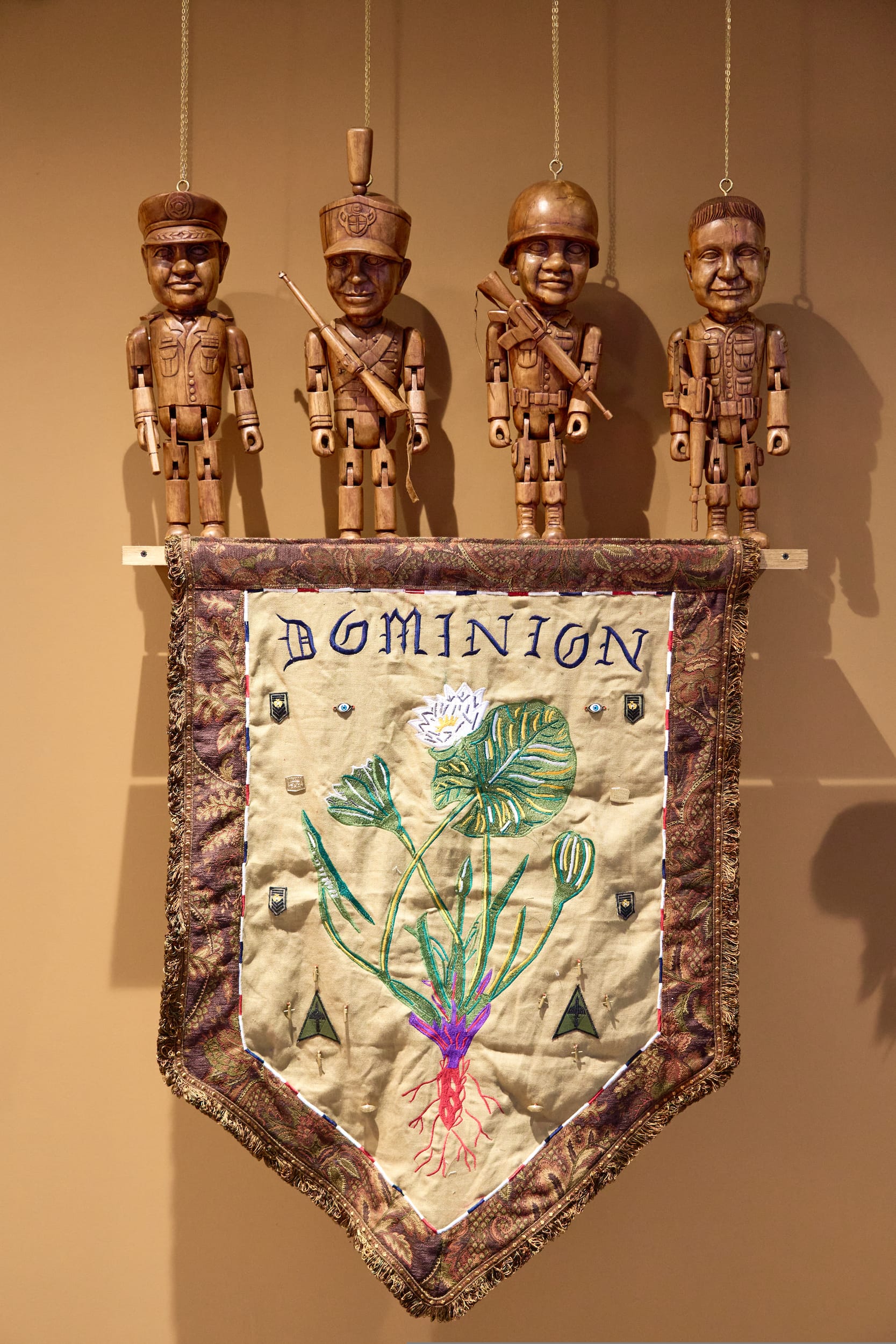 Cian Dayrit, "lmperial Puppet Regalia" (2022), embroidery on textile, woodwork sculptures, weaving and craftwork (dimensions variable) (photo courtesy BAB)