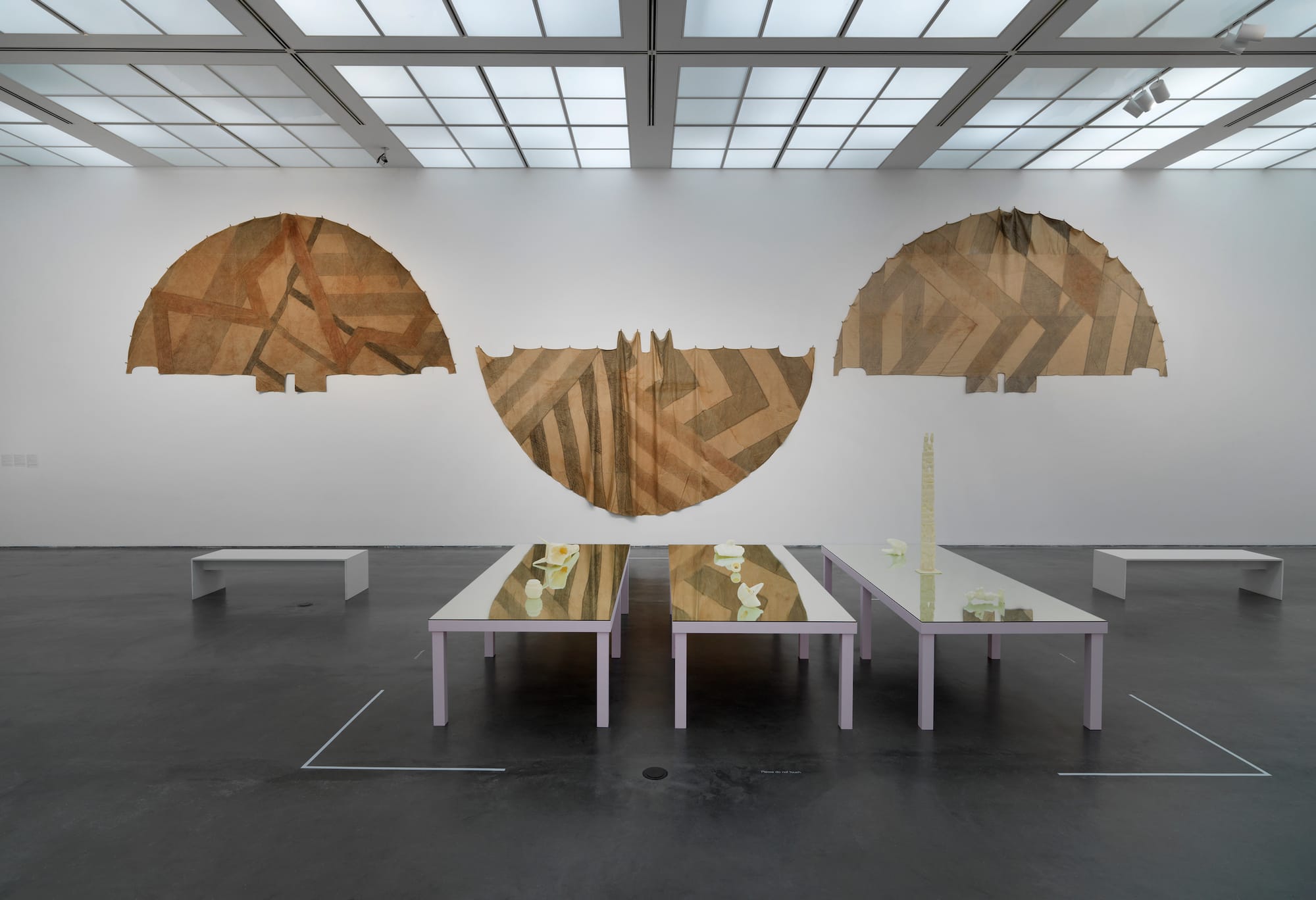 Duane Linklater’s (Omaskêko Cree) exhibition mymothersside, organized by the Frye Art Museum in Seattle and presented at MCA Chicago, probed and dismantled colonial legacies of oppression ensconced within museums, looking at their historic and contemporary modes of operation and the ways in which they have harmed and continue to harm Indigenous peoples. Linklater’s works redress the exclusion of Indigenous content in museums as well as the inclusion of Indigenous art and cultural material devoid of first-person voices from Indigenous communities. The MCA iteration of the show concentraed on the semiotics of Indigenous architecture, creating large-scale sculptures of tipi poles and canvases adorning the walls and pooling on the floor. In another series, he critiqued museums and their collecting practices by 3D-printing replicas of Indigenous objects in museum collections and, resting them on large, mirrored tables, implicating the viewer in perpetuating coloniality in museums. —Erin Joyce