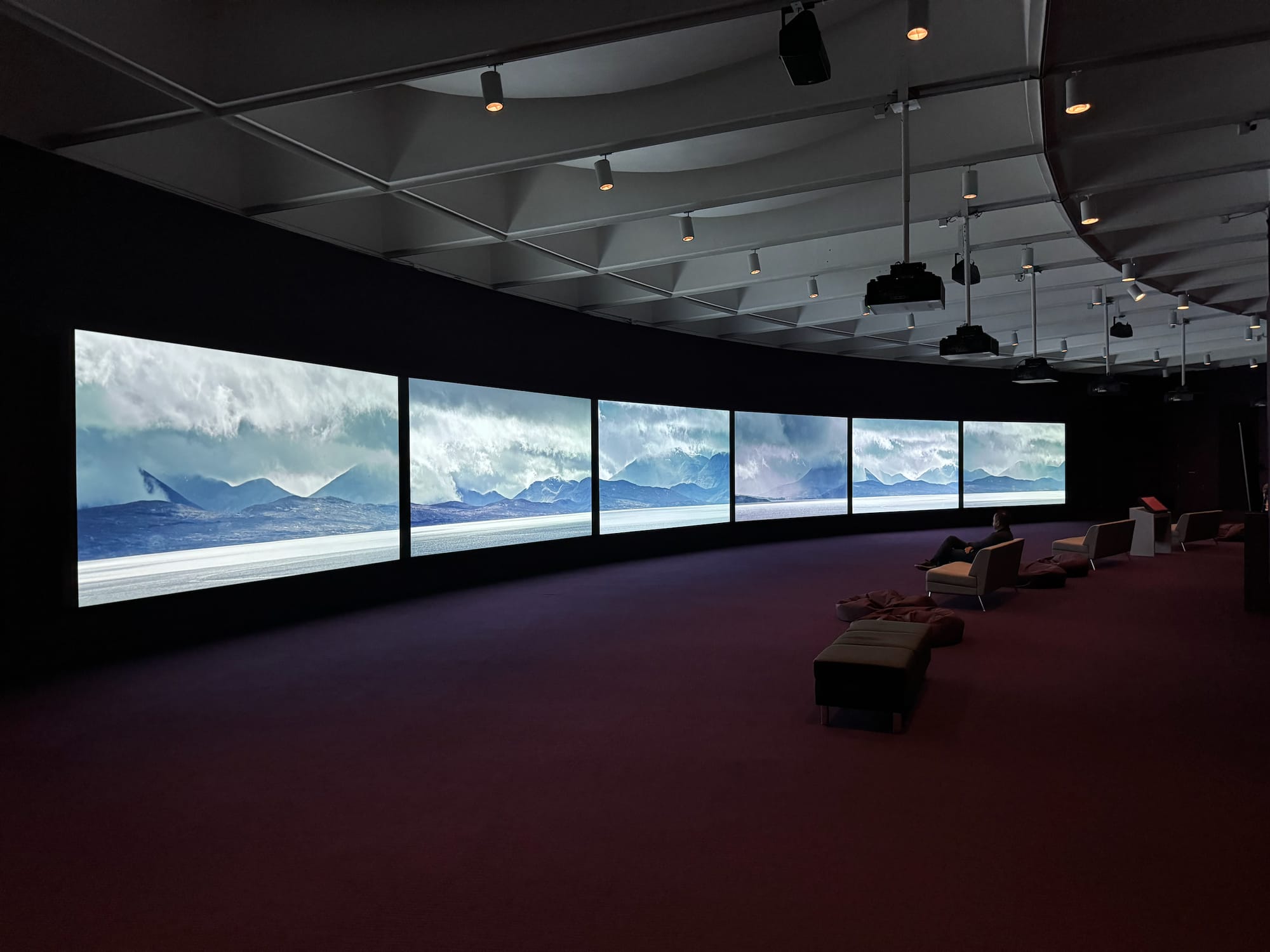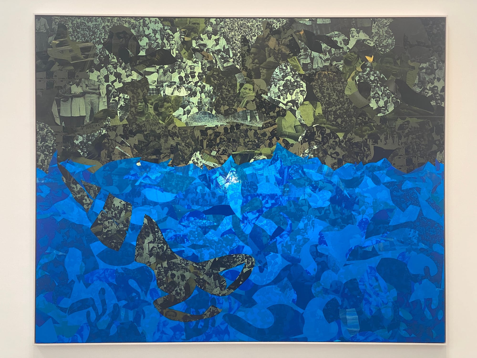 While the six-channel “Purple” (2017) focuses on the environment and the operatic tragedies unfolding before us while governments whittle away any chance to heal the human-made catastrophe, the three-channel “Five Murmurations” is a diasporic meditation on systemic violence, acts of protest, and the circulation and distortion of images around the strong emotions that galvanized people into action in 2020 after the murder of George Floyd by a Minneapolis police officer.