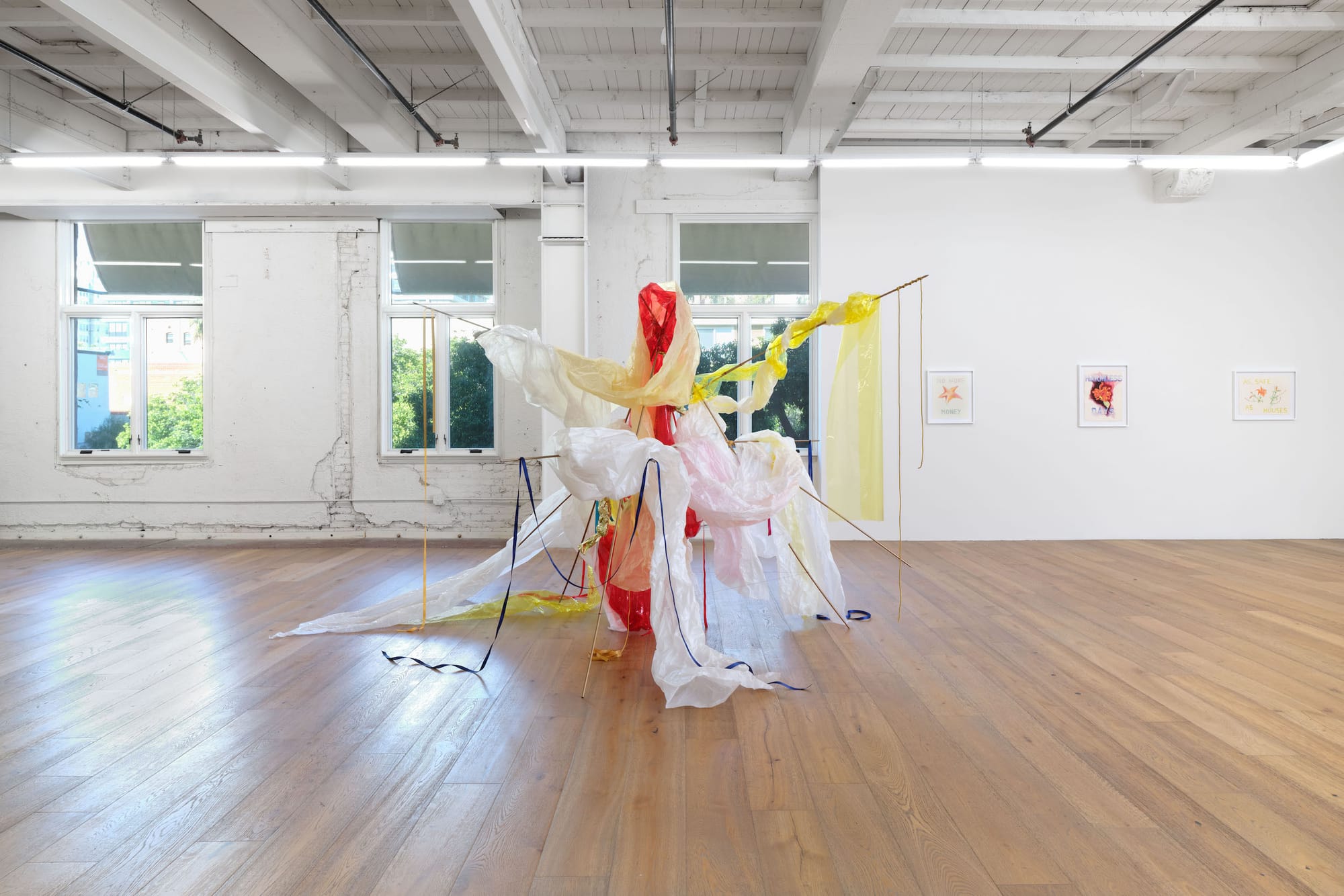 Installation view of Rosemary Mayer: Noon Has No Shadows at Hannah Hoffman Gallery, in collaboration with Marc Selwyn Gallery, Los Angeles; foreground: "1924 Ghost"(1980–81/2023), paper, ribbons, string, cords, wooden rods, and metallic paint, 78 x 146 x 96 inches (photo by Paul Salveson, courtesy The Rosemary Mayer Estate; Hannah Hoffman, Los Angeles; and Marc Selwyn Fine Art, Los Angeles)