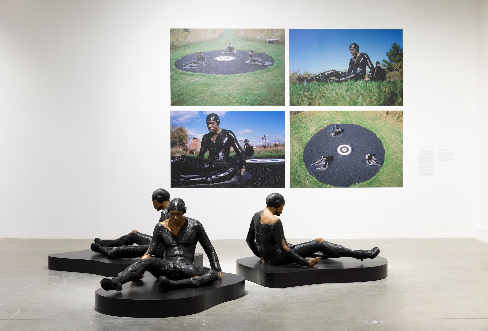 Foreground: Michael Richards, "Are You Down?" (1999), resin, metal, tar. 3 elements, each 48 x 60 x 60 inches; wall: Michael Richards, "Are You Down?" (2000), fiberglass, bonded bronze, resin, concrete, black beauty sand, installed at Franconia Sculpture Park (photo courtesy the Museum of Contemporary Art, North Miami and The Michael Richards Estate)