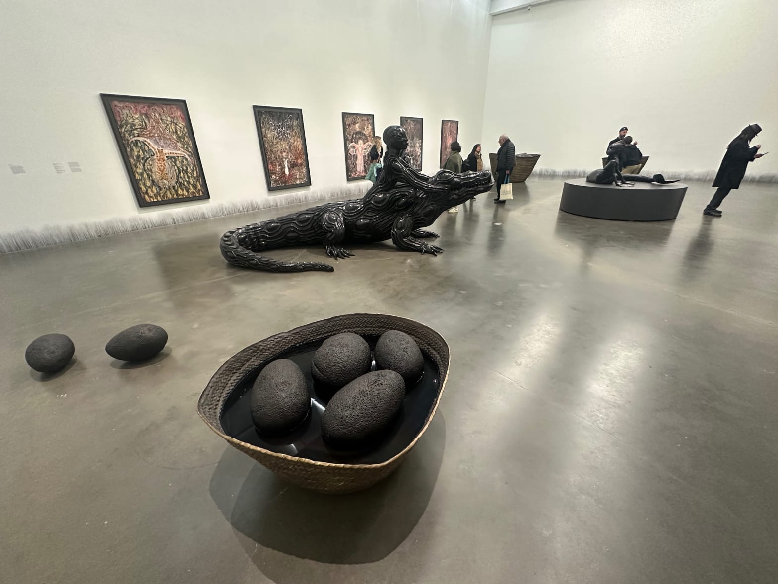 “Heads in a Basket” (2021) in the foreground, with “Crocodylus” (2020) in the midground, and other basket works in the background (photo Hrag Vartanian/Hyperallergic)