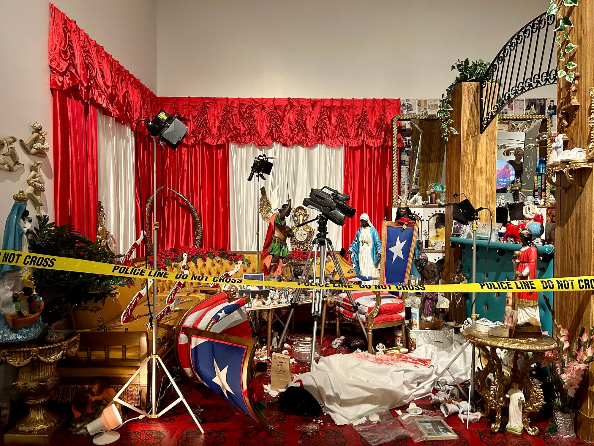 Pepón Osorio, "Scene of the Crime (Whose Crime?)" (1993), mixed mediums and video installation, 112 x 244 5/8 x 146 3/4 inches (photo Valentina Di Liscia/Hyperallergic)