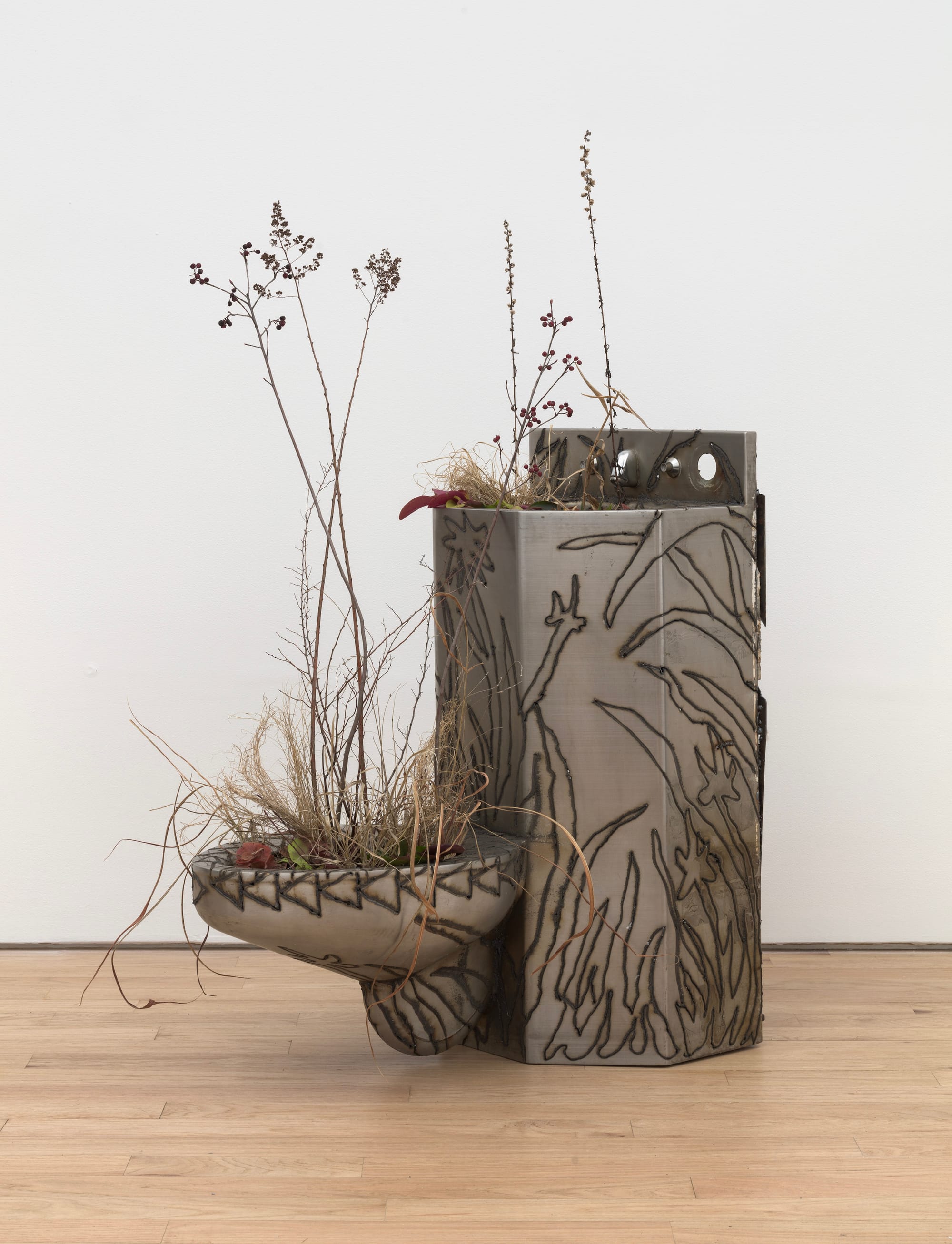 Saif Azzuz, “Full of Kwech” (2022), steel jail toilet filled with Eastern Gamagrass, Purple Love Grass, Seabeach Sedge, Foxglove beardtongue, American Alumroot, Red Chokeberry, White Meadowsweet, Pointed Broom Sedge, and Deertongue, 34 inches x 32 inches x 19 inches (image courtesy Nicelle Beauchene Gallery)