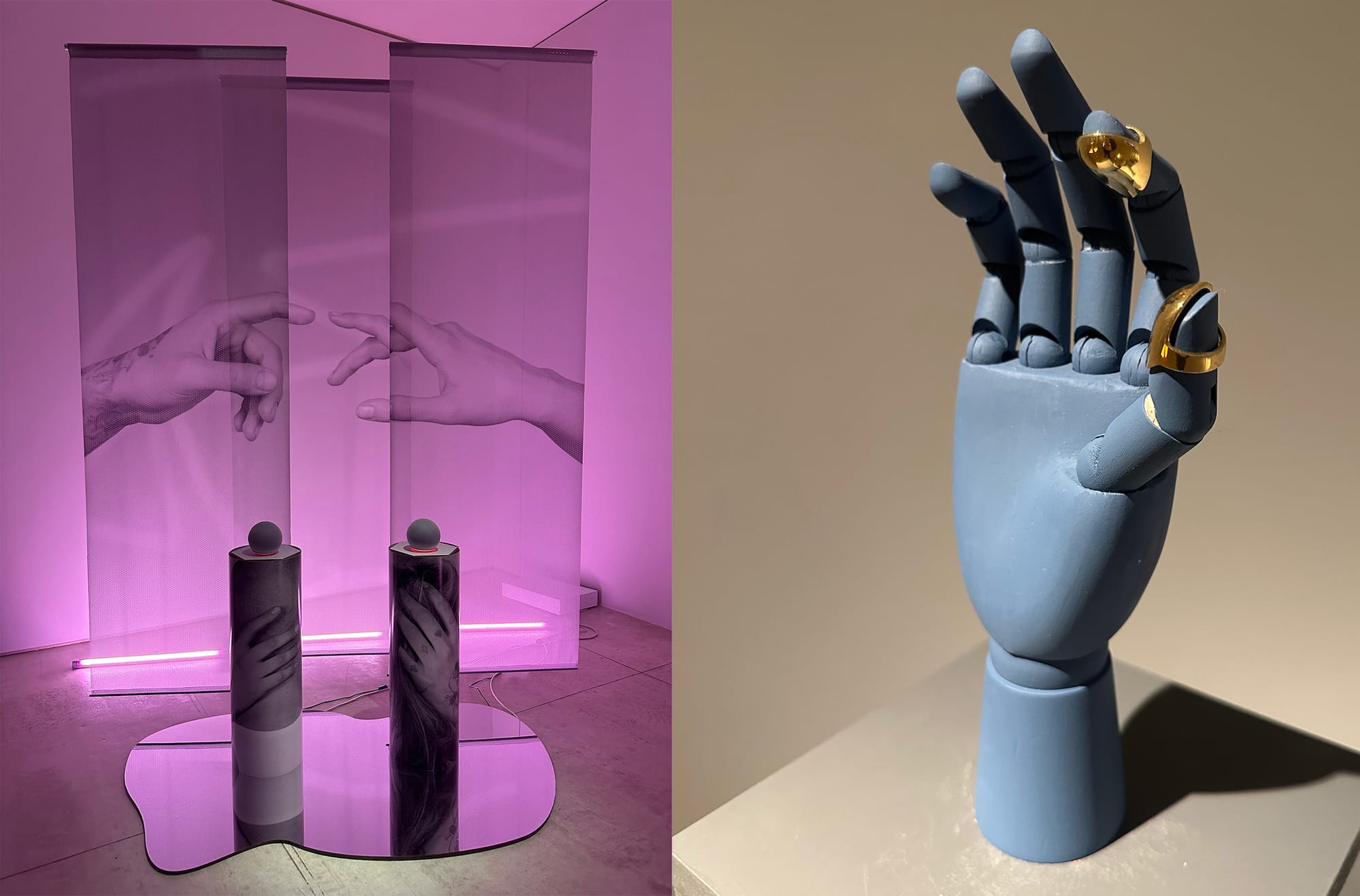 Left: Marge Monko’s “I Don’t Know You, So I Can’t Love You” (2018); right: Hannah Toticki’s “Touch Screen Protection Rings” (2019) (photos Hrag Vartanian/Hyperallergic)