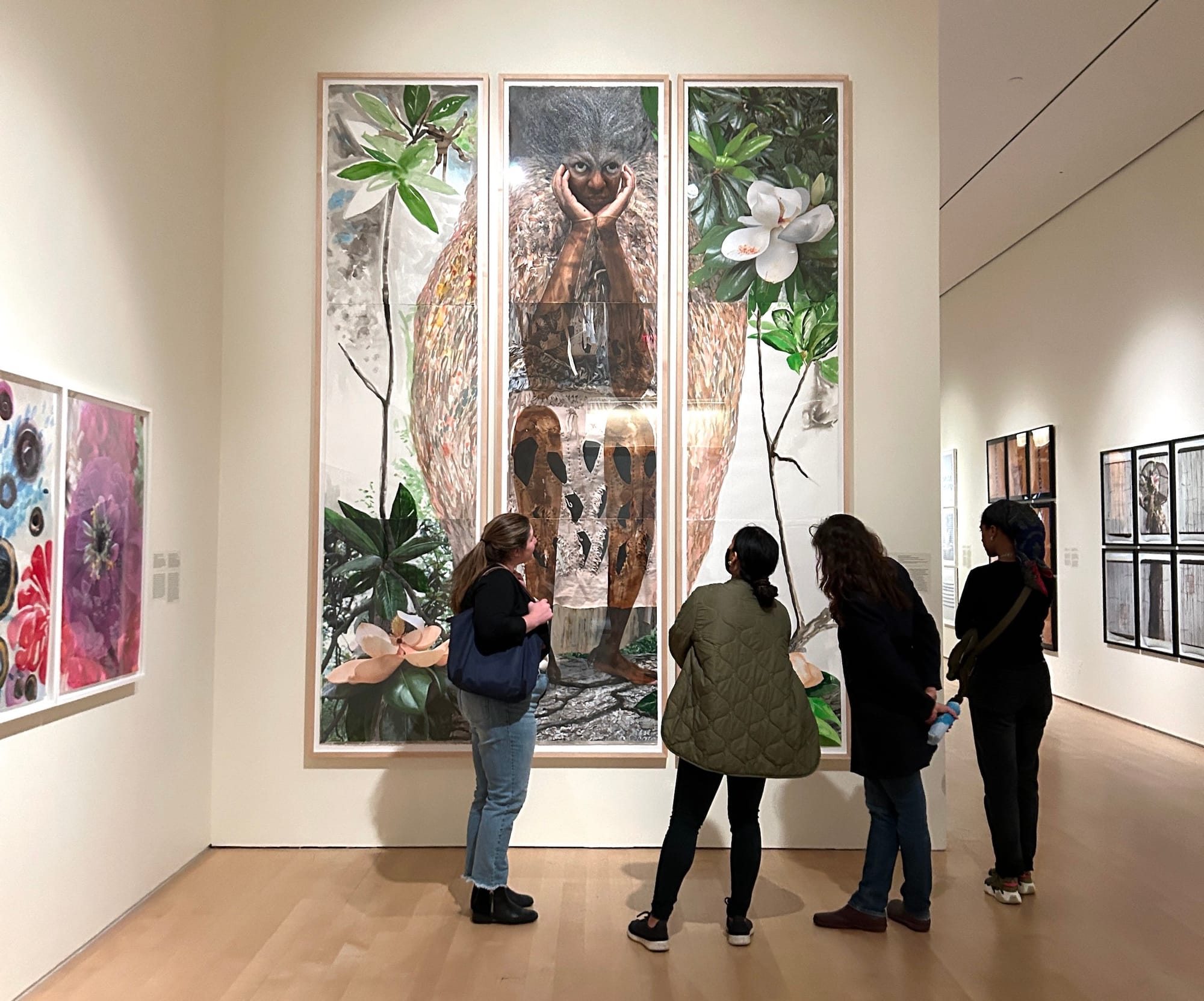 Visitors admire María Magdalena Campos-Pons’s “Secrets of the Magnolia Tree” (2021) at the Brooklyn Museum. (photo Valentina Di Liscia/Hyperallergic)