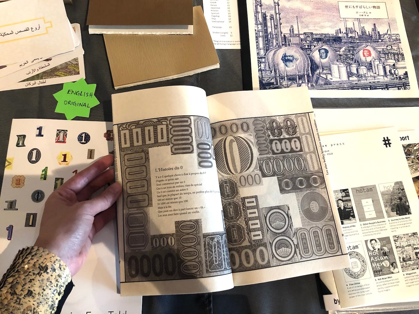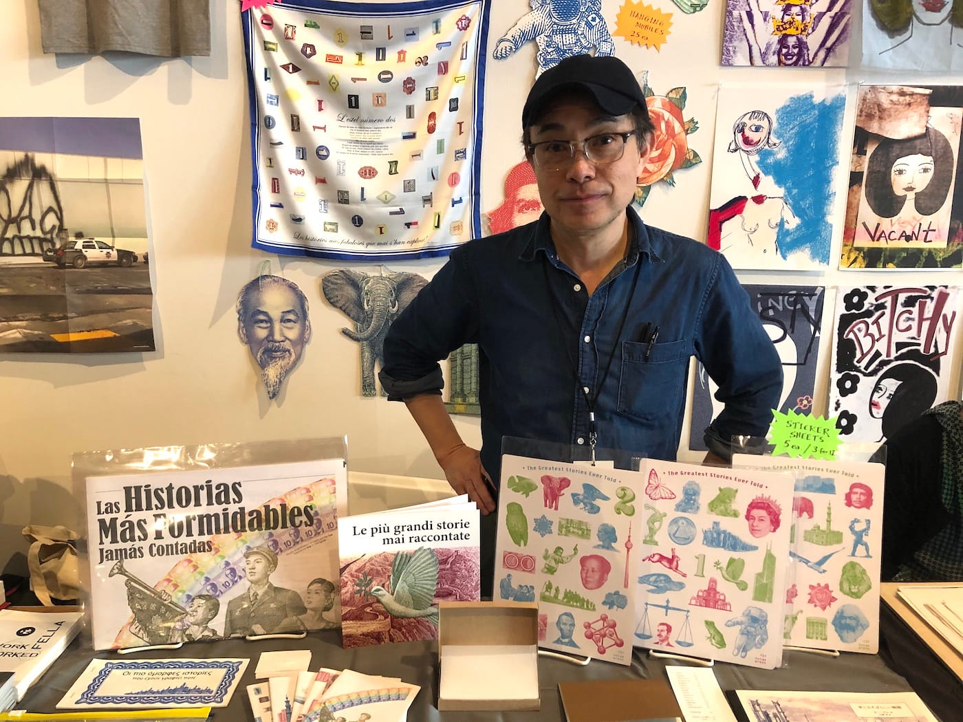 My first stop at the fair was Hotam Press, and it felt like fate. The Vancouver-based publisher only brought one book, titled The Greatest Stories Ever Told, but each copy is in a different language and takes on a different shape. Ho Tam, the founder, wrote the story originally in English, and commissioned translators to render his tales into Greek, French, Arabic, Korean, Tagalog, and many more languages. As a translator myself, I poured over each copy, noting the differing lengths in lines. Each language also gets its own format: the Spanish edition comes as a newspaper, the Arabic as a stack of cards, and the French is delicately rendered in black and white. They are lovely metaphors for the very act of translation: a translated story becomes, in a sense, a new story, assuming a slightly altered character.