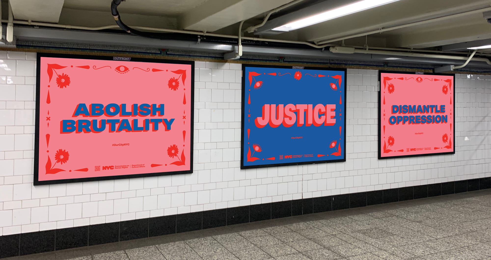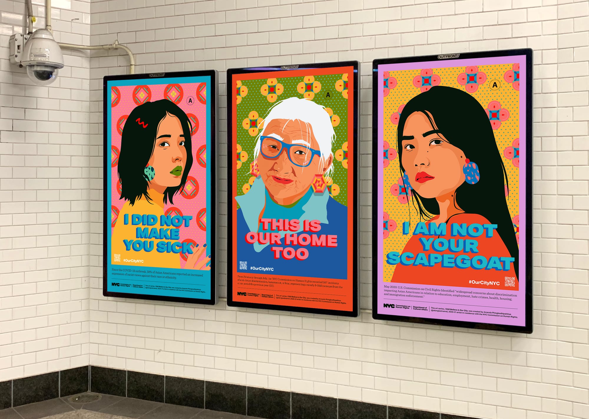 Amanda Phingbodhipakkiya, the Publci Artist in Residence at the Human Rights Commission, addressed this concerning phenomenon with an ad takeover of the Atlantic Avenue subway station in Brooklyn. Titled "I Still Believe in Our City," the public art installation celebrates New York's diversity with a series of 45 panels featuring vibrantly colored portraits of Black, East Asian, and Southeast Asian residents of the city. These portraits are accompanied by anti-discriminatory messages like “I did not make you sick,” "This is our home too," and “I am not your scapegoat.”