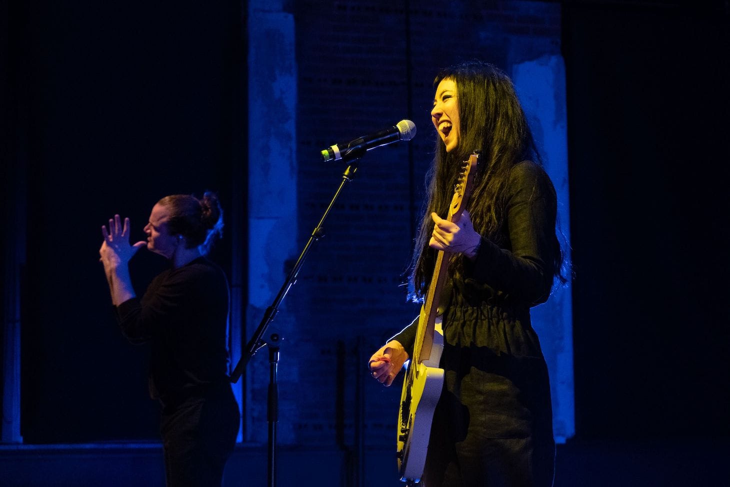 Johanna Hedva dressed in all black, playing a guitar and singing with their mouth-wide open into a microphone. There is a sign language interpreter interpreting behind them.