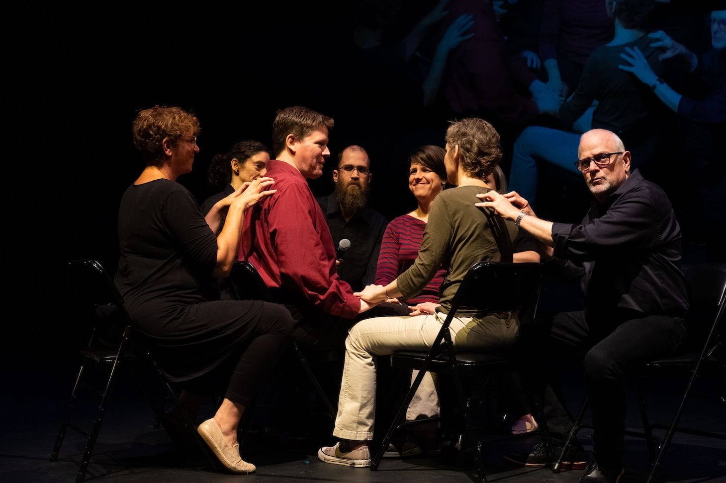 John Lee Clark was joined on stage by two other DeafBlind poets, Hayley Broadway and Rhonda Voight-Campbell, who all used Protactile language to deliver their poems to each other. An interpreter observed them communicating, and shared it verbally and audibly, which was then transcribed and projected onto the screen behind the performers, and signed in visual American Sign Language (ASL). Voight-Campbell’s poem was verbally translated as “the trees are blowing in the wind, swaying, rocking. The sunlight penetrates the tree.” These sparse words are less compelling than what was observed visually: Clark and Broadway held their arms together like a tree trunk, their fingers wiggling like waving branches. Voight-Campbell took hold of their wrists in order to move their arms together in wide circles, and blew her breath into their open palms. Then Voight-Campbell ran her hands up their arms — the sunlight creeping from the roots to the branches — and ended by interlacing her fingers with theirs in a strong clasp. I assumed this visual experience to be a lesser translation than what was felt tactically by Clark and Broadway.
