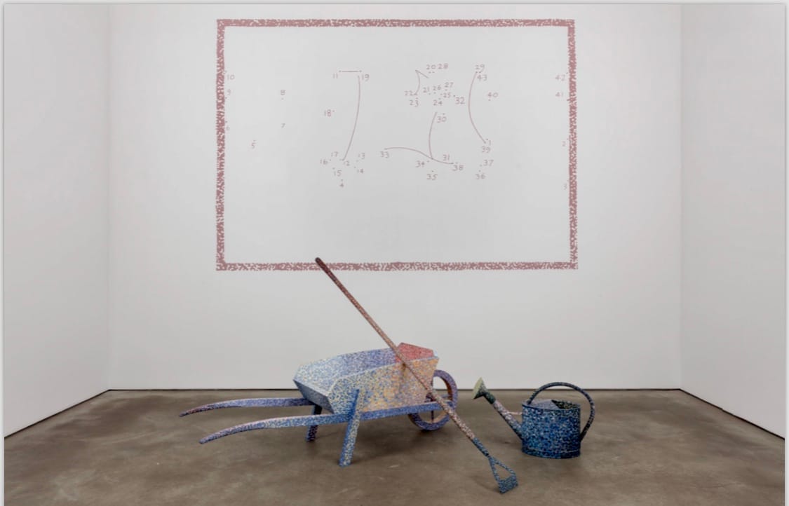 In the installation, “Homage to Seurat” (1995), made with Gary Hincks and Candida Ballantyne, a blue wheelbarrow, a blue watering can, and a partly blue hoe, all of which are speckled with mostly red and yellow dots, has been placed in the middle of the room, in front of a wall painting. The painting is defined by a band of brown dots. Inside, we see a few lines and a lot of numbers, suggesting we are to “connect” the dots, so to speak. Even as this joke surfaces in your consciousness, you realize that the dots you must connect are those on the gardening implements to the white space demarcated by numbers and a few gracefully billowing vertical and lines, offset by one horizontal. As you begin thinking about this, you might notice that the dotted frame is brown (earth) and the garden implements are blue (water and sky). It quickly becomes apparent that the numbers and lines allude to one of Seurat’s maritime scenes and that we are to connect gardening with the ocean, which we also harvest. However, do we replenish what we harvest?