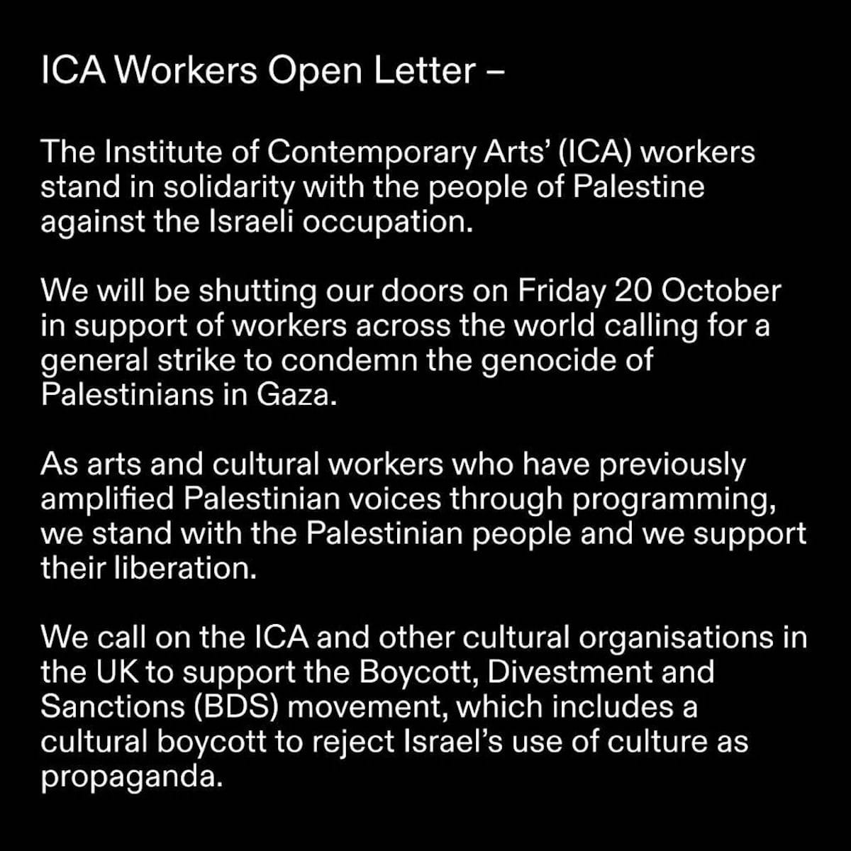 Earlier this month, a group of former ICA workers alleged that the institute fired them in connection with participating in the October 20 Global Strike for Palestine and posting an open letter on the venue’s website calling for a cultural boycott of Israel without the approval of ICA's leadership.