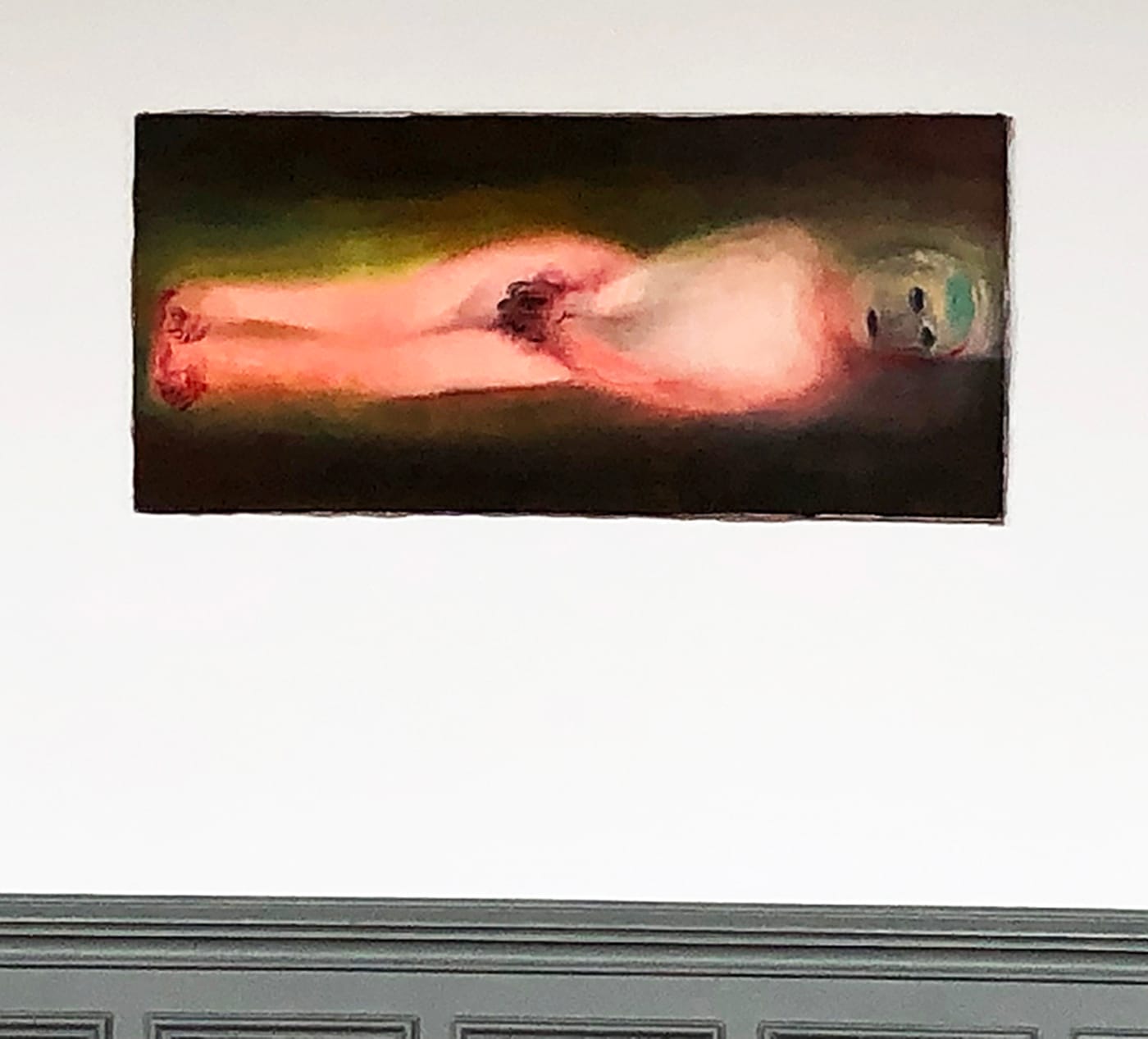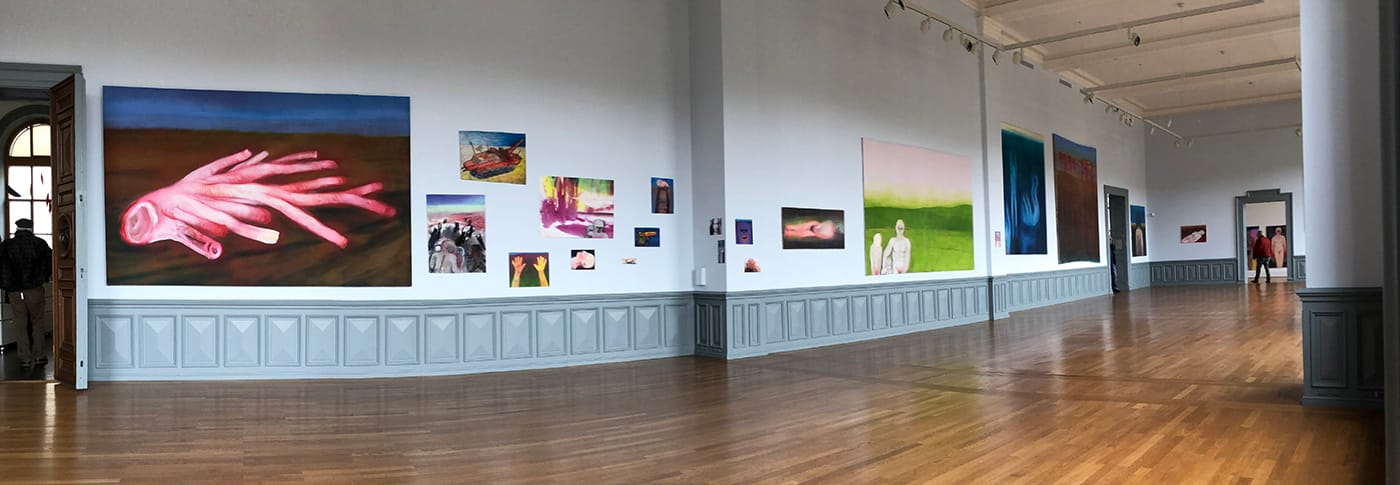 “Ich als Mensch (I as Human),” the current exhibition by Miriam Cahn at the Kunstmuseum Bern, Bern, Switzerland, installation view: large painting (left), “herumliegen/fremdkörper, 12.5. + 13./16.6.2016” (2016), oil on canvas, 78.7 x 118.11 inches