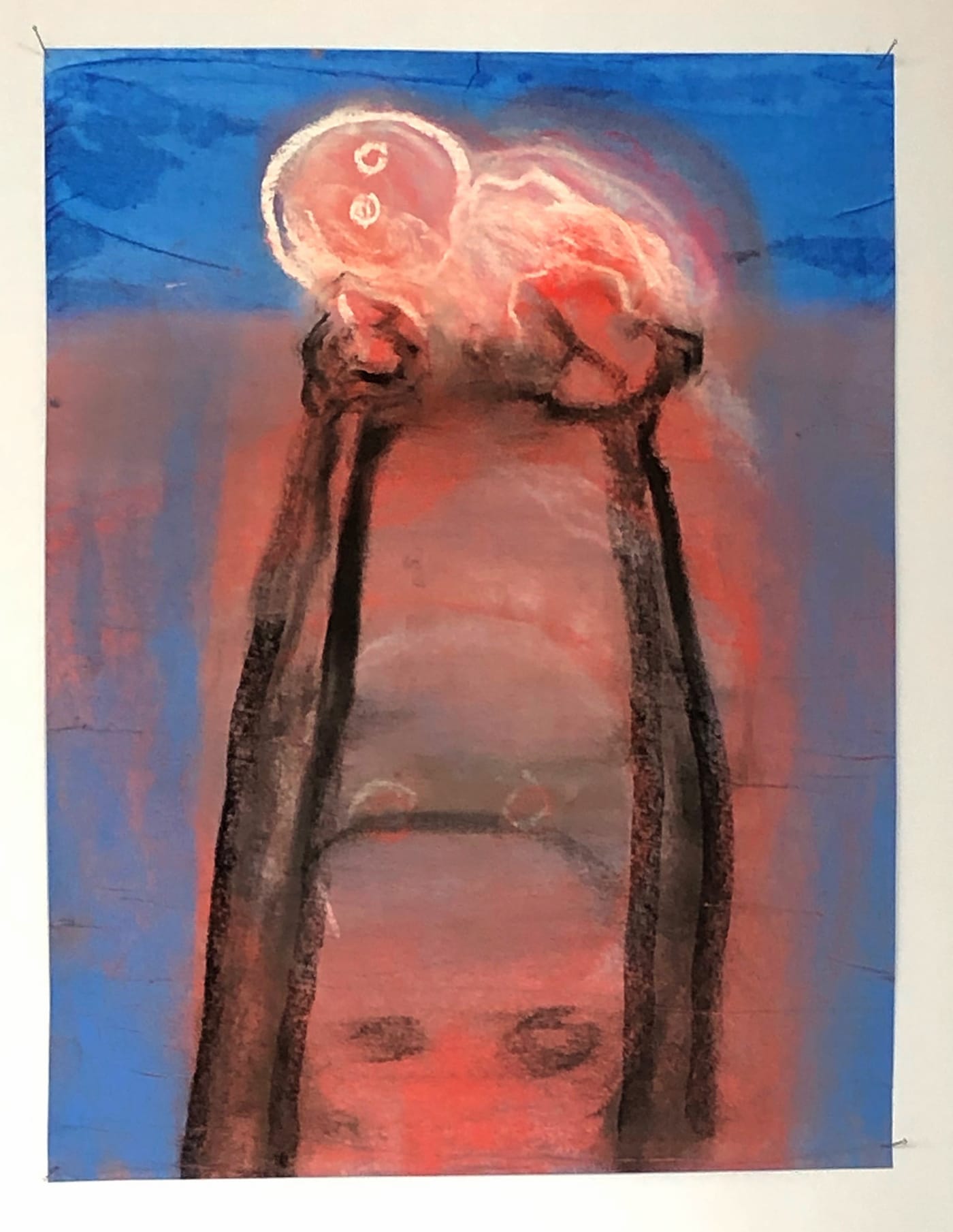 Cahn’s political consciousness informs many of the works on view in I as Human, sometimes in an oblique or nuanced manner, and sometimes not, touching on such topics as war, Europe’s refugee crisis, racism and bigotry, or sexually motivated violence, explicitly that against women. In “ohne titel, 11.5.17” (“untitled, 11.5.17,” 2017, watercolor and pastel on paper) an emaciated figure raises its arms to hold a spectral infant high above its head. In “gebet, 30.11.+1.12.03” (“prayer, 30.11.+1.12.03,” 2003, oil on canvas), a naked figure in repose — or is it dead? — covers its crotch with clenched hands, and in “BLAU, 21.07.17” (“BLUE, 21.07.17,” 2017, oil on canvas), a group of phantom-like figures fall like unmoored bodies in a blue, glowing, dream-like cascade.