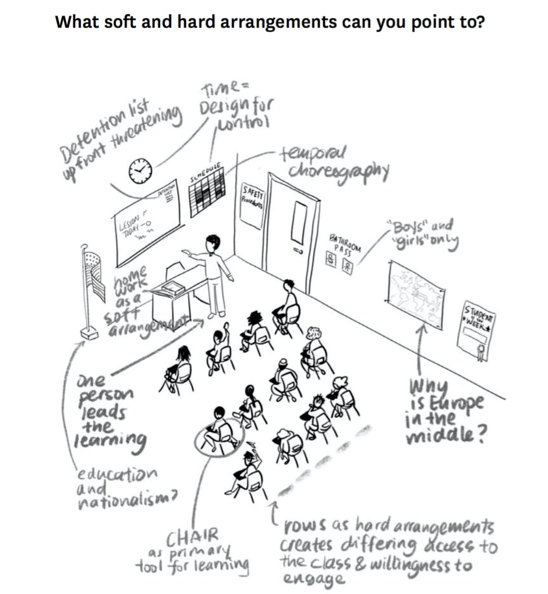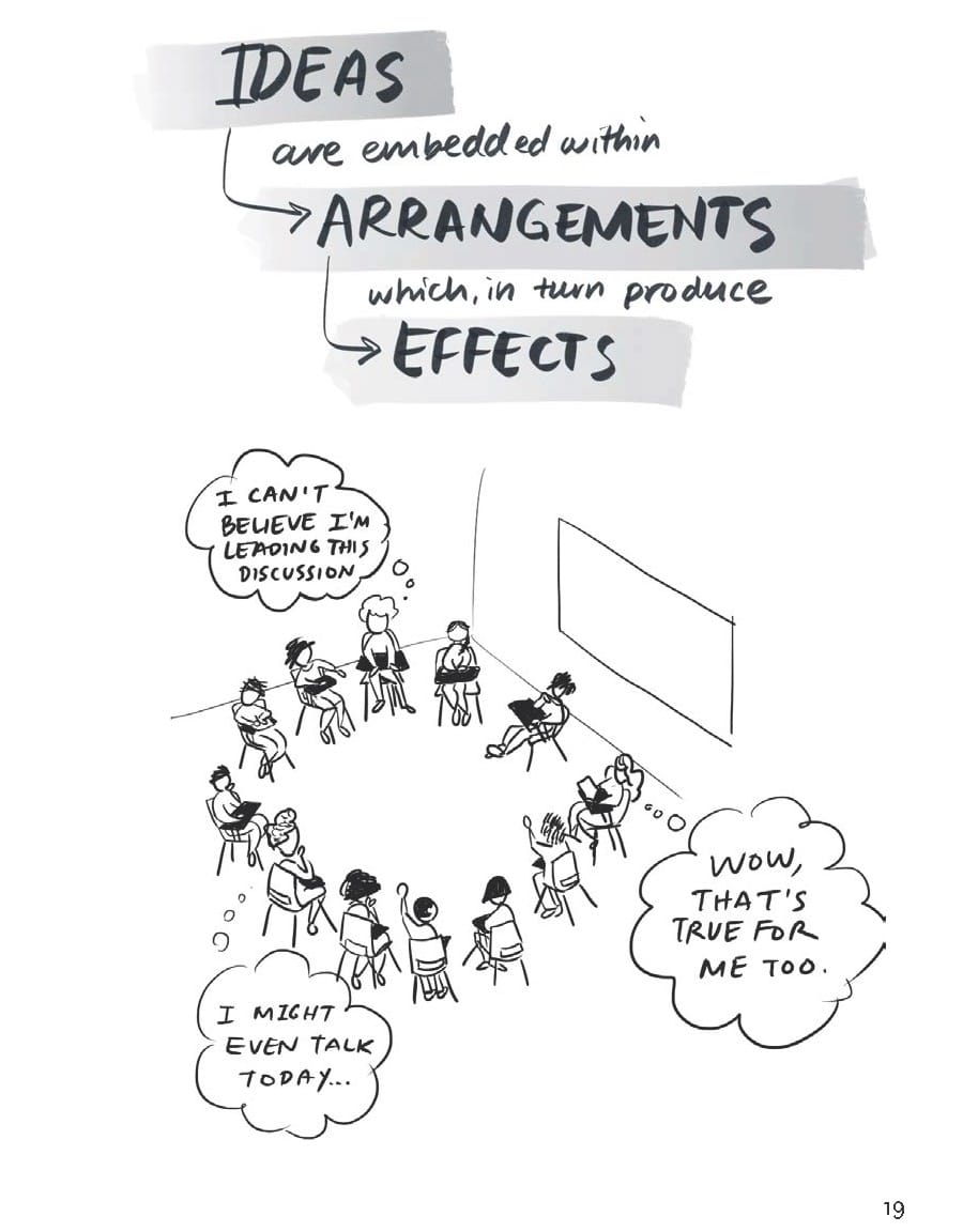 Ideas, Arrangements, Effects looks at first glance like it will be academic — it has a relatively academic title and cover image, and a thoughtful foreword by a formidable post-structuralist anthropologist. But then the introduction shifts into a handwritten-style font, and much of the rest of the book has a whiteboard-sketch feel that has come, in the 21st century, to signify that we are in the realm of design thinking. You are immediately invited to read it non-linearly, to write and draw in it (co-author it!), and otherwise test its limits as both an approach and a text. Included photo documentation of DS4SI’s work belies a more traditional activist aesthetic (and crystal-clear intentionality) right beneath this. The writing style, which is equally committed to the windows of possibility opened up by design-oriented approaches to creating social, political, and structural change, and the sharp urgency of societal transformation needed within the realms that DS4SI investigates, is as accessible to discontented teens as it is to life-long organizers, educators and policy makers.