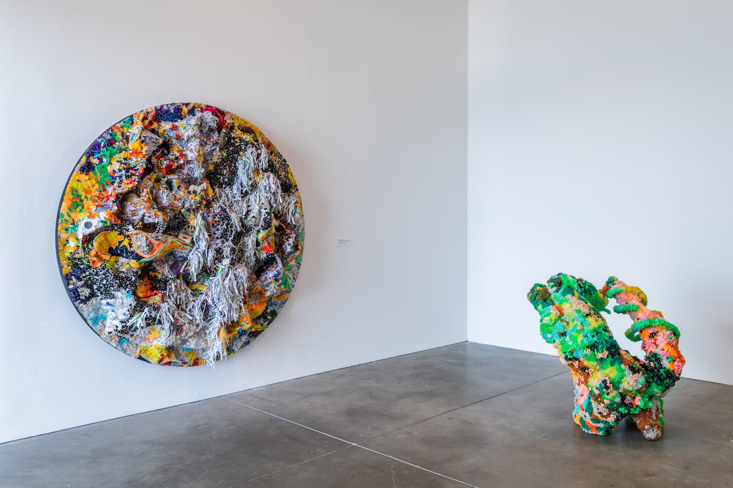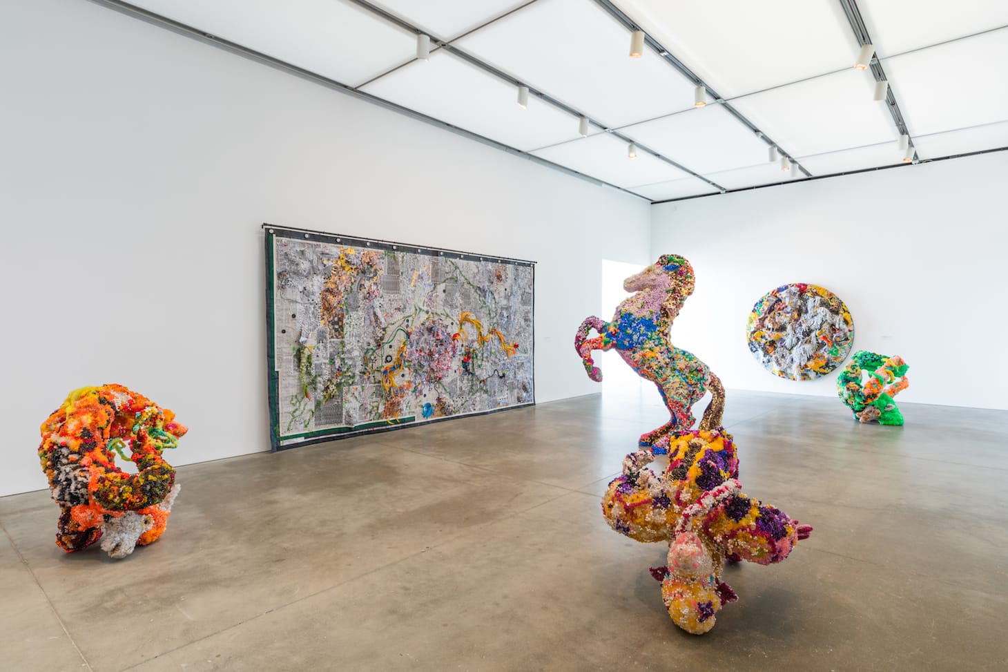 Walking through the single-gallery exhibition is much like entering a dancehall. It requires careful choreography to avoid bumping into the writhing human-horse hybrid statues, frozen in various stages of handstands and flips, their high-heeled shoes gleaming in the air and arched in motion. These energetic statues, installed in the center of the gallery, set the tone of the show. The large wall-mounted works radiate the same frenetic energy, but they are embedded with European art historical references. Woven between the paper butterflies, fake flowers, and rosaries are the edges of Picasso paintings and black and white MC Escher-like geometric patterns.