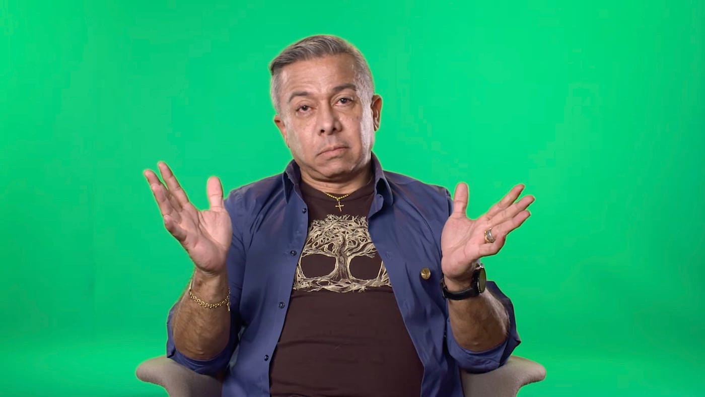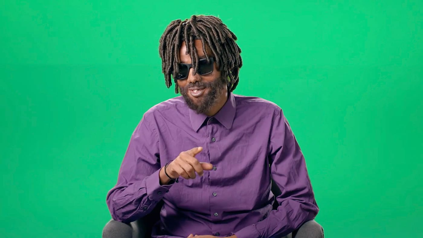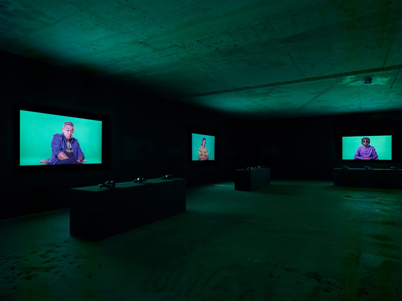 Love Story deconstructs the Hollywood tendency to whitewash and, in the process, subverts and exposes it, rendering the practice directly visible and audible. The dark, cavernous space of KOW lends itself particularly well to Breitz’s seven-channel film installation. Upon entering, the viewer is immediately confronted with Baldwin and Moore recounting the tales of six individuals, each filled with love, loss, hope, and hopelessness. The 73-minute video features the two actors in medium and close-up shots as they take on the different roles of the individuals interviewed by Breitz in New York, Berlin, and Cape Town in late 2015. These six individuals, whom Breitz casted through personal relationships and contacts, include a Somalian (Farah Abdi Mohamed), a Syrian (Ezzat Mardini), a Venezuelan Luis Ernesto Nava Molero), an Indian (Francis Saveri), a Congolese (Mamy Maloba Langa), and an Angolan (José Maria João), — all of whom have unique memories that deserve individual attention. They are all seated in front of green screens, a neutralizing background that allows the viewer to narrow in and focus on their stories, which are at times saddening and confusing but also funny and laden with anecdotes about love and friendship. Baldwin and Moore take on their roles dutifully, capturing the mannerisms of their characters with compassion and emotion.