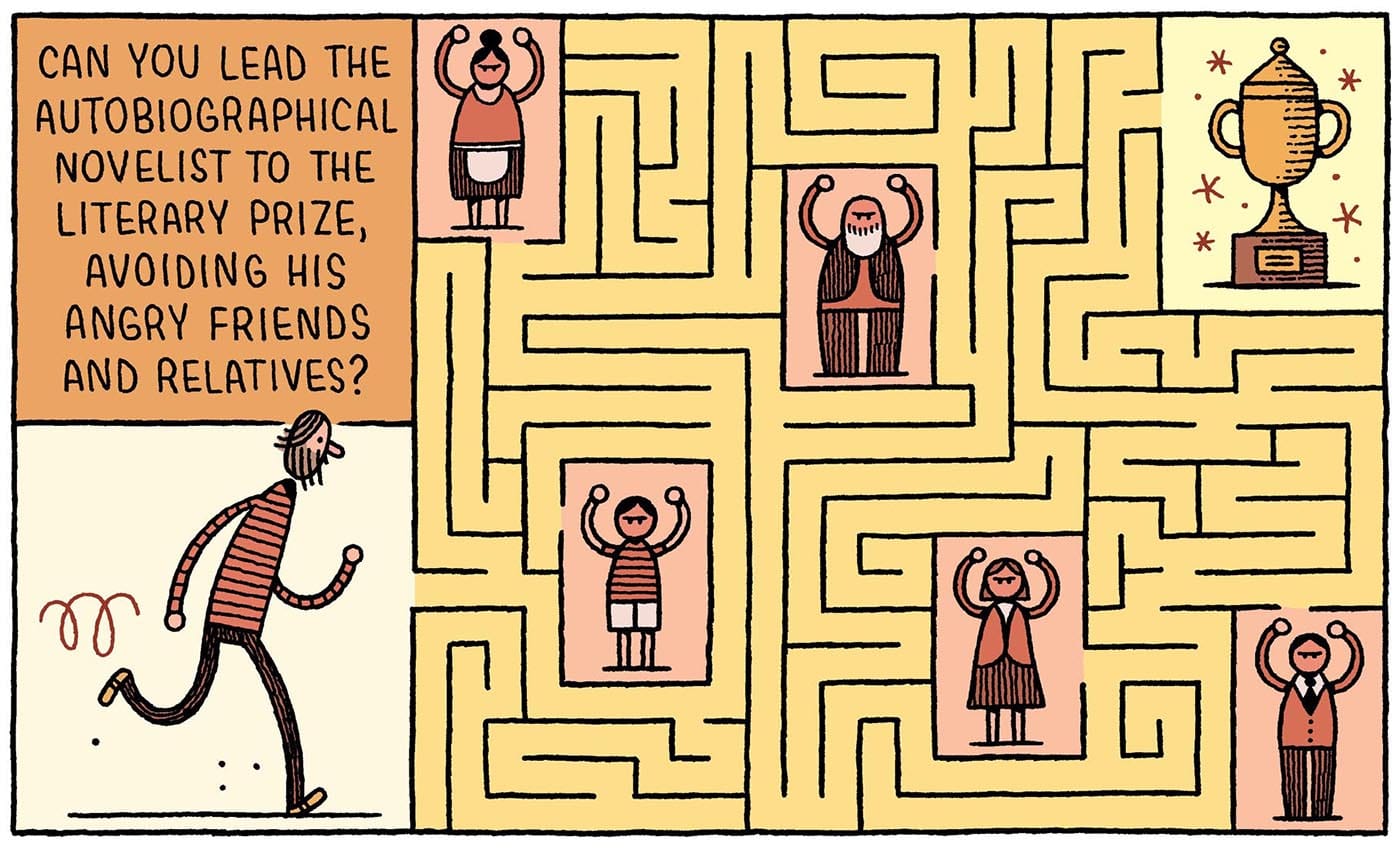 Gauld’s simple, almost cute drawing style stands in contrast to his comics’ content, adding an extra dose of humor. The anthropomorphic books having identity crises in the face of new technology, the literally one-dimensional characters aspiring to develop in a badly written story, and even the “angry friends and relatives” fuming at the award-winning autobiographical novelist — a bearded fellow, probably Karl Ove Knausgård — are all drawn in the same manner.