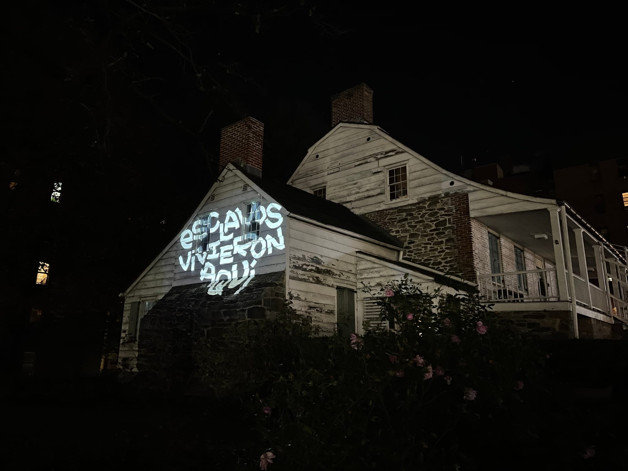 Artist Reggie Black is projecting a message about the history of slavery in New York City on the façade of the Dyckman Farmhouse Museum in Manhattan, where six people were enslaved.