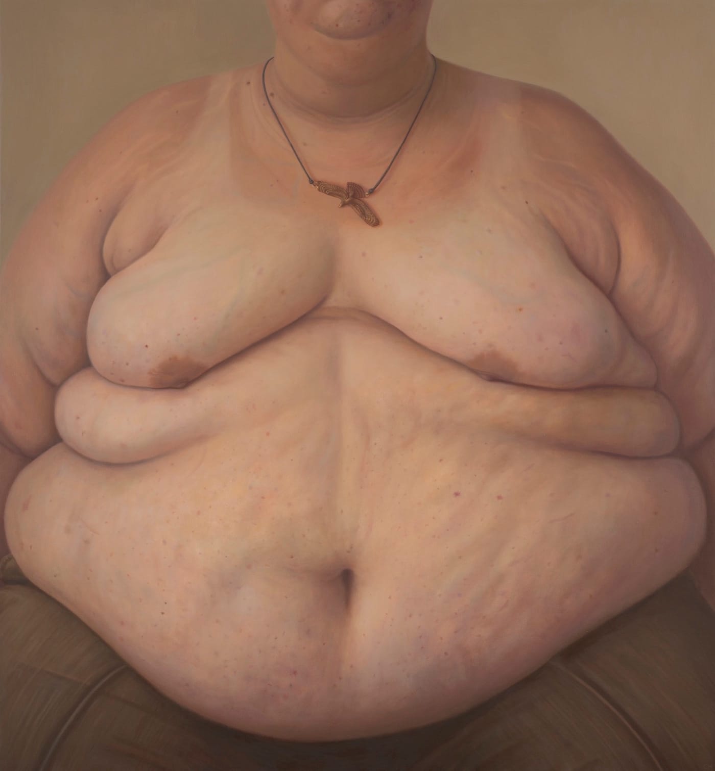 I paint large portraits of the bare torsos of women, trans, and gender nonconforming people. The paintings celebrate my lesbian gaze and community, and point to the body as a topography of our life experiences. Scars, wrinkles, stretch marks, and tattoos tell intimate stories of surgeries, survival, and self-determination. In many ways, my work is about confronting and healing shame. I’ve been working with this subject matter since the late ’90s.