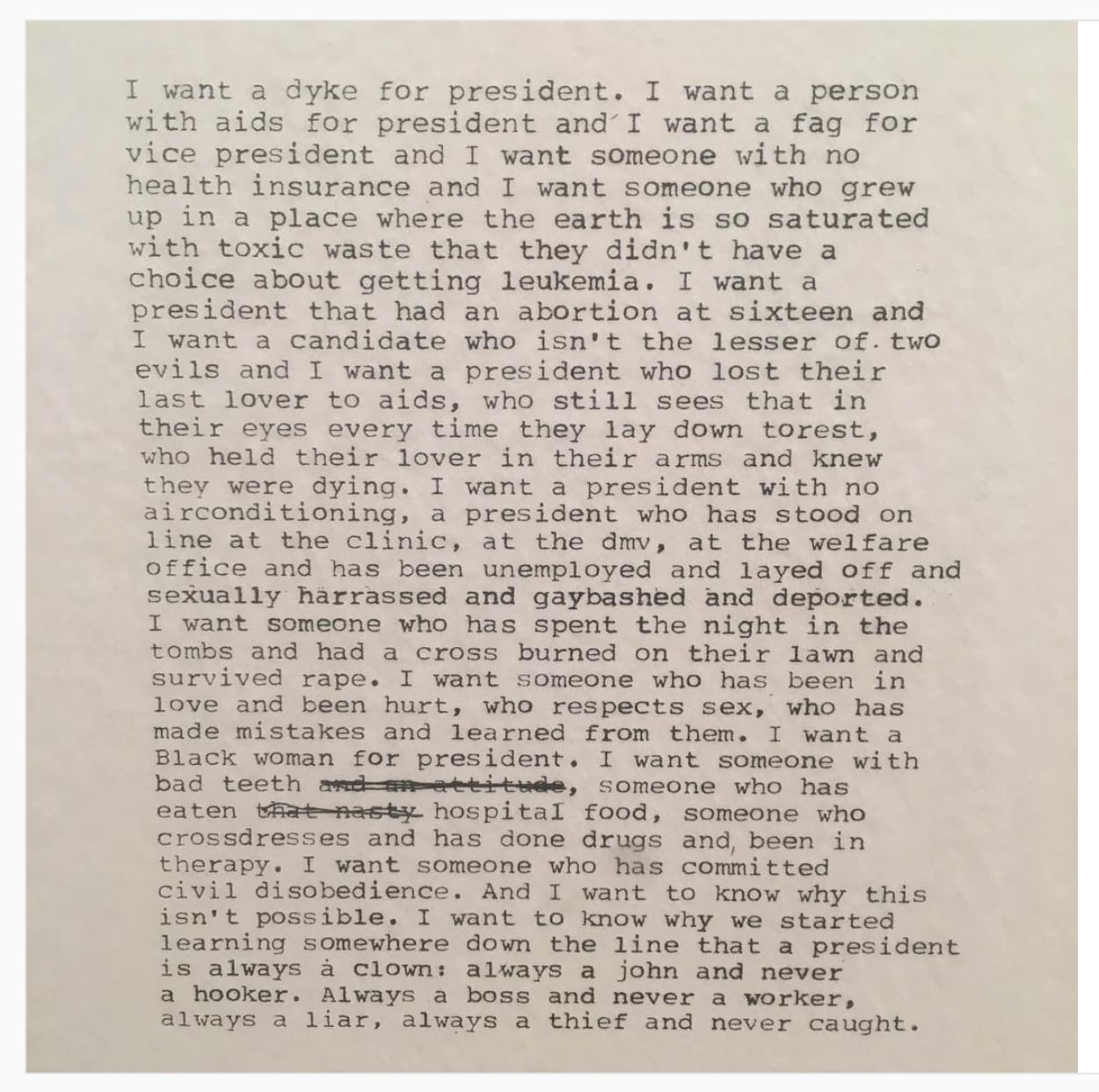 Recently, I posted a 1972 photograph by the legendary lesbian artist Barbara Hammer on Instagram. The photo depicts two women with short hair standing and wrestling outside in the sunshine, wearing jeans but no shirts. It was deleted within a few hours. Around the same time, the Zoe Leonard poem “I want a President” was removed repeatedly from multiple feeds in my Instagram circles. The poem begins, “I want a dyke for president.” It would seem that much of queer feminist culture is unfit for social media.
