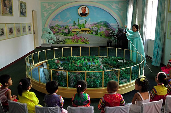 A photo by Tomas Van Houtryve of Nursery-school children being told by their teacher to revere Kim Il Sung, the "Great Leader." (via time.com)