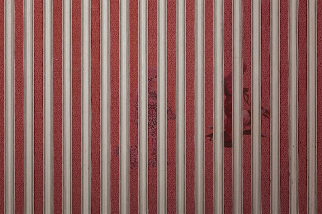 As its title suggests, “Geist” is haunted by something, the specter of two figures — either soldiers or guards. Insinuated within the lovely surface of old, striped wallpaper, its red pattern overlapping with vertical white bars, the two figures flit across its face, sort of the way history folds imperceptibly into and out of an old cityscape — felt but not seen, seen but not heard. For Lee, they recall the memorial stones or stolperstein that commemorate the names of Jewish and other victims of the Holocaust in towns across Germany. But unlike those plaques, “Geist” is buried in the wallpaper of a ruin; it seems to be far away, excluded from the everyday. But installed in Momenta’s gallery — in the form of two simple, unframed photographs — this estrangement and distance seem a success, an example of photography’s ability to convey but also conceal, bringing you closer to something that remains out of reach.