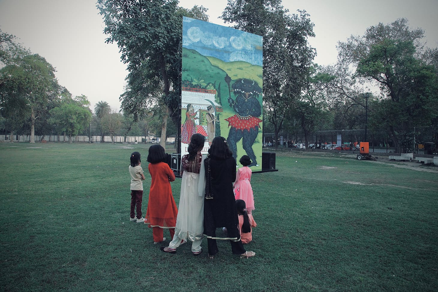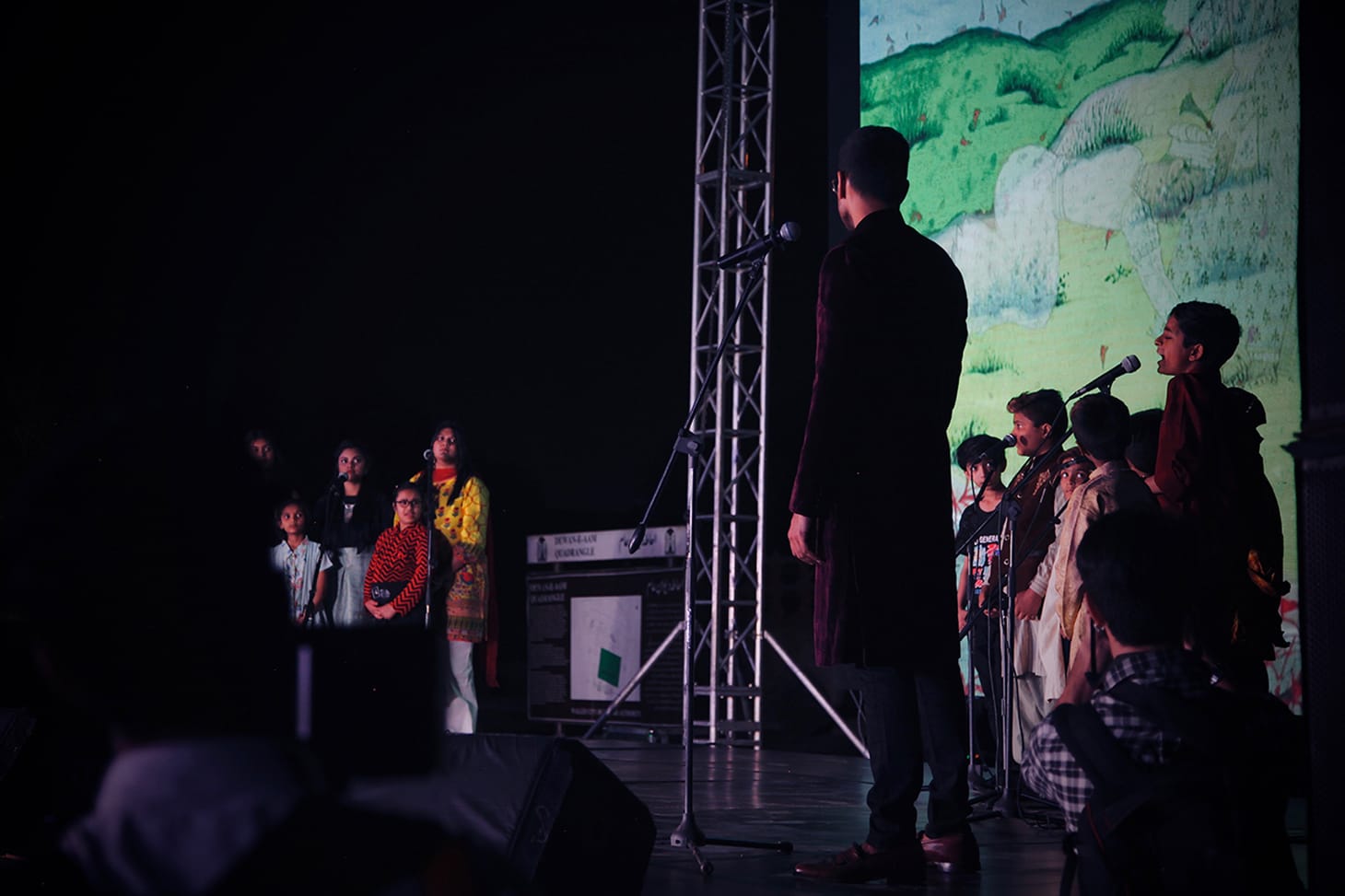 …we decided to involve the girls’ choir and the children under training of the musicians of the old city of Lahore. The fort is within the old city of Lahore. The video is an animation and the visual vernacular and storytelling is of the region. There was immediate affinity with the work from the young musicians who through their participation also became part of the work. The context of the Mughal architectural site did not seem incongruous as the work itself was dissecting the ‘hidden’ plurality within the linguistic, musical, visual, religious and spiritual cultures of the sub-continent.