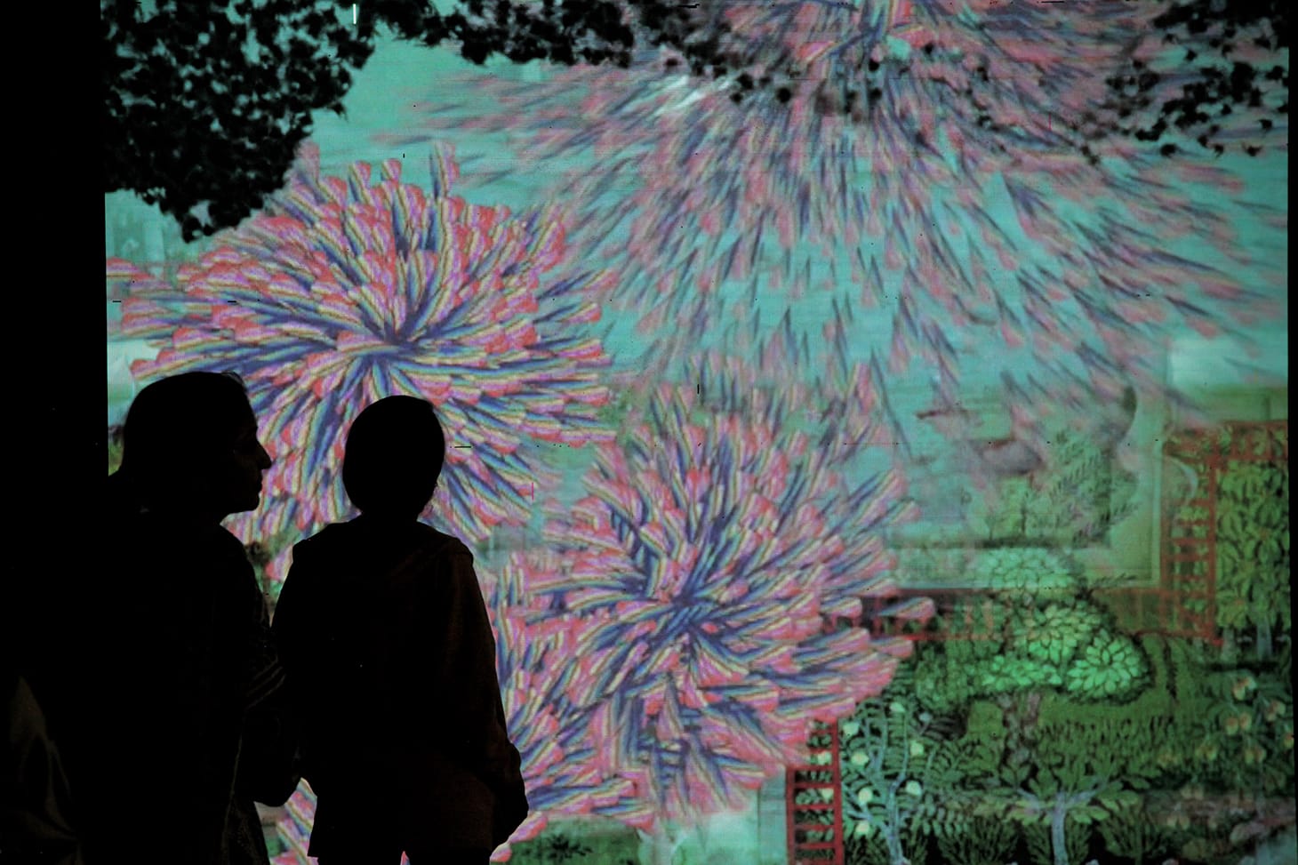 One of the two locations in which the animation “Disruption as Rapture” was installed was Alhamra garden, a space open to the public until midnight. The 10-minute film is an interpretation of the 18th century manuscript Gulshan-i ‘Ishq (Rose Garden of Love) in the Philadelphia Museum of Art’s collection. The poem is written in masnavi form in Deccani Urdu and Persian naskh script, the language of the Muslim elite in South-Central India. This North Indian Hindu love story is recast as a Sufi tale for an Islamic court. Not even the most erudite of scholars can decipher the text of the Gulshan-i ‘Ishq let alone grasp the story’s many layers given its heterogeneous qualities: for Sikander, this was a productive point of entry into the work.