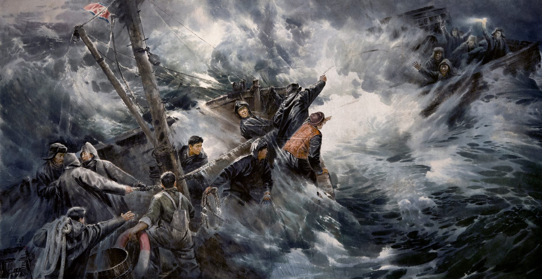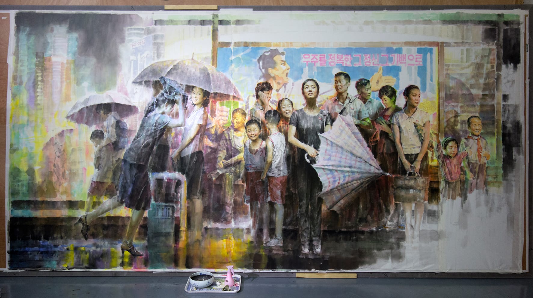At the North Korean Art show, Muhn aimed “to find out and confirm the current divided status of the Korean peninsula through North Korea’s Chosunhwa.” With the collapse of socialism in the 1990s, the art of Socialist Realism in Eastern Europe has disappeared, yet North Korea has developed its own unique genre called Chosunhwa. The ideological paintings in the first section realize Muhn’s ambition. Like other socialist nations, North Korea has sanctioned ideological paintings primarily for publicity purposes, and sometimes multiple artists work on a single large-scale painting. However, Chosunhwa techniques have become unique over last three decades. In the collective work, “Self-reliance With On Our Own Effort” (2014), the Chosunhwa artists maximize the illusion of three-dimensionality and the composition’s dynamics by using Sumuk-Color Painting, a traditional Korean watercolor method. Choe Chang Ho’s portrait, “A Worker” (2014), supports Muhn’s thought with realistic depiction of a blue-collar worker. In this Chosunhwa painting, the nuanced color palette and lack of an outline add visual depth to the character. This technique distinguishes Chosunhwa from contemporary Hangukwha — traditional South Korean painting — in which artists use outlines to define figures emphasizing flatness of the scene.