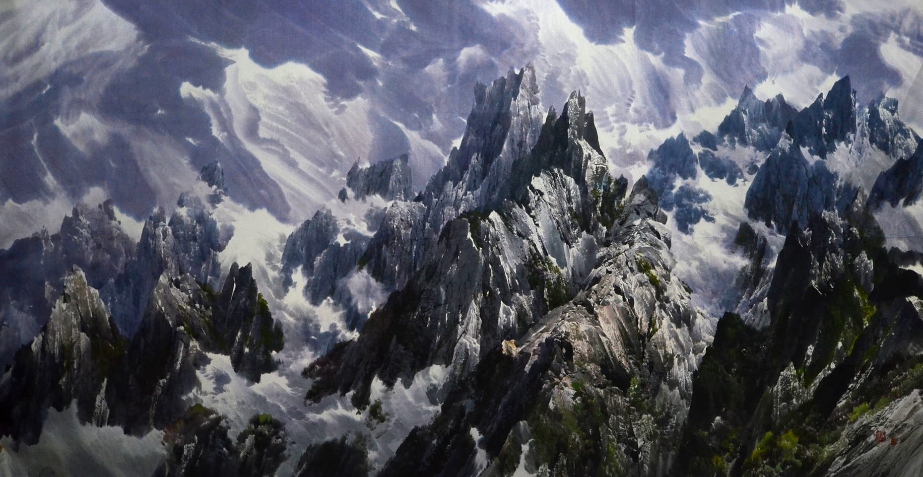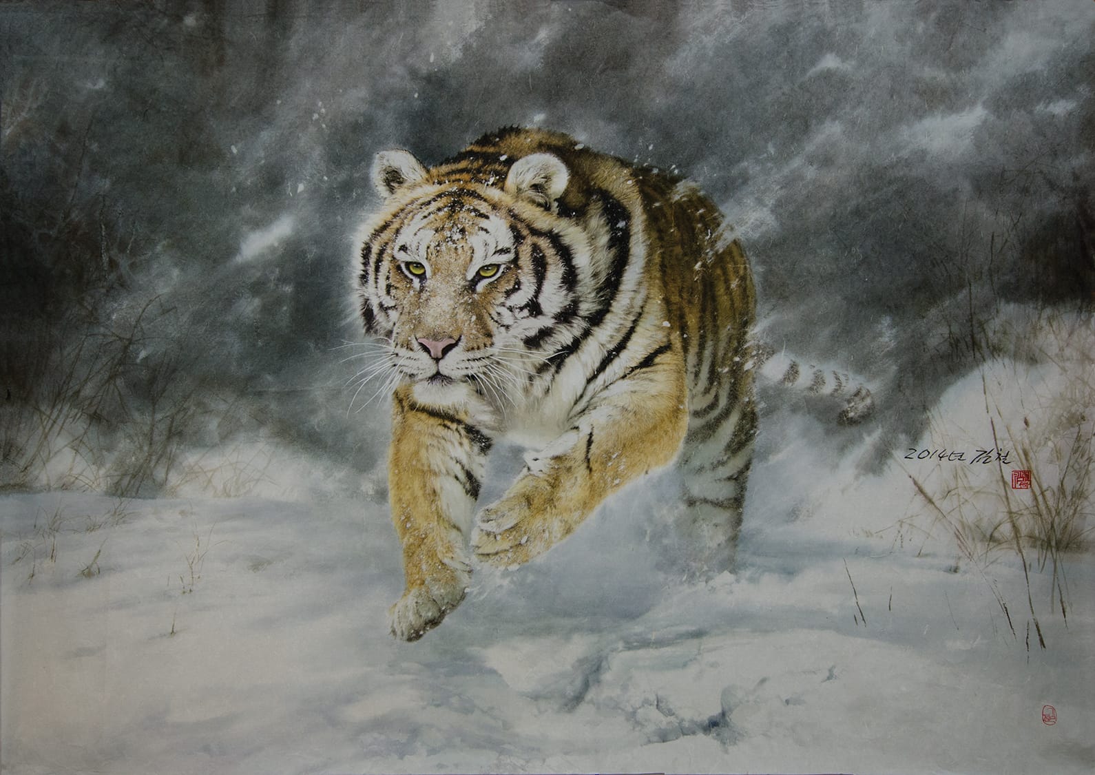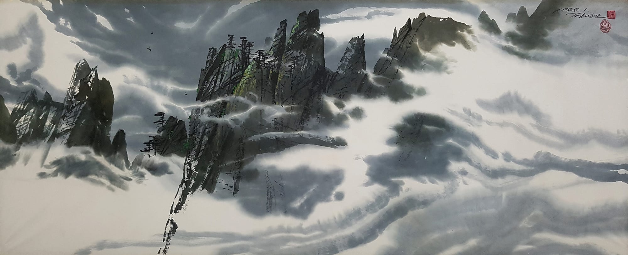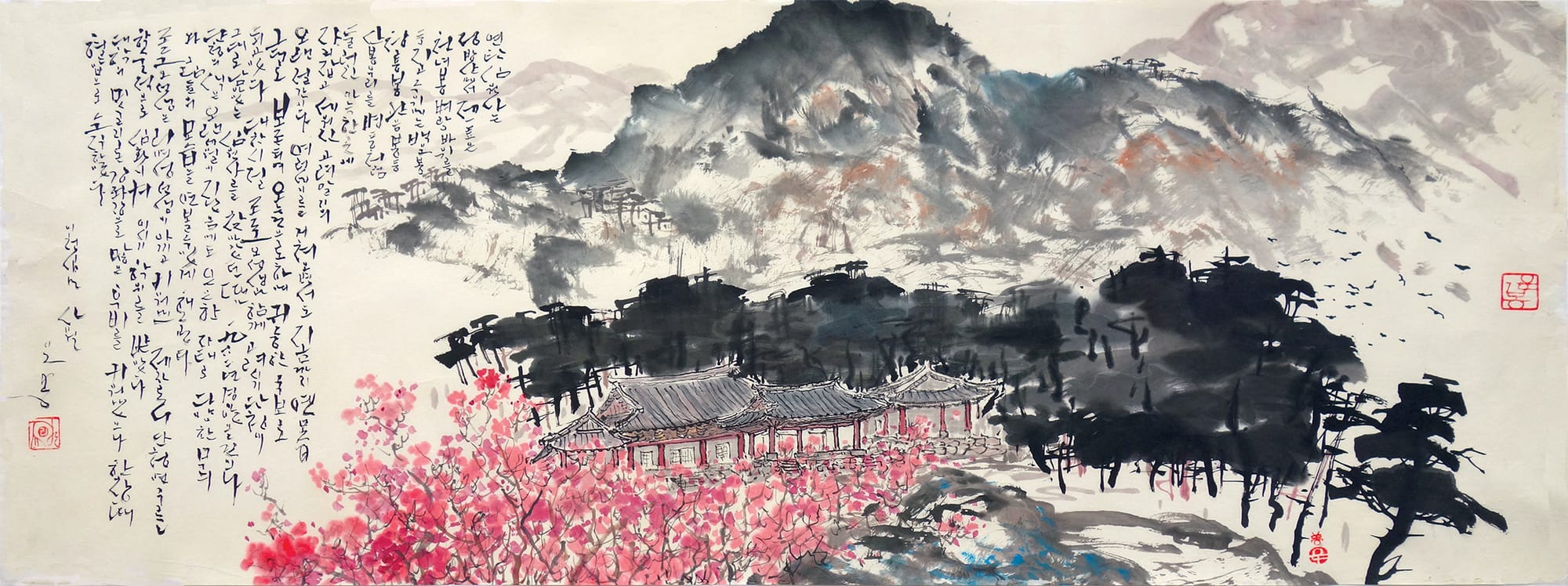 In addition to ideological paintings, we can find landscape, “literati,” and animal genres. The literati class, called Sadaebu, spent its leisure time by creating landscape paintings accompanied by short poems expressing emotions, while the North Korean government considered enjoying leisure time as antithetical to proletarian values. In the past it was commonly thought that the North Korean government denigrated literati paintings. However, the work of Un Bong, an art historian and artist, debunks this belief. In his technique, he adds abstract forms, colors, and writing to differentiate his work from traditional literati paintings. In addition, apparent differences between landscape paintings of Mt. Kumgang by two artists, Choe Chang Ho and Jong Yong Man, suggest that North Korean society has embraced artistic individualism.