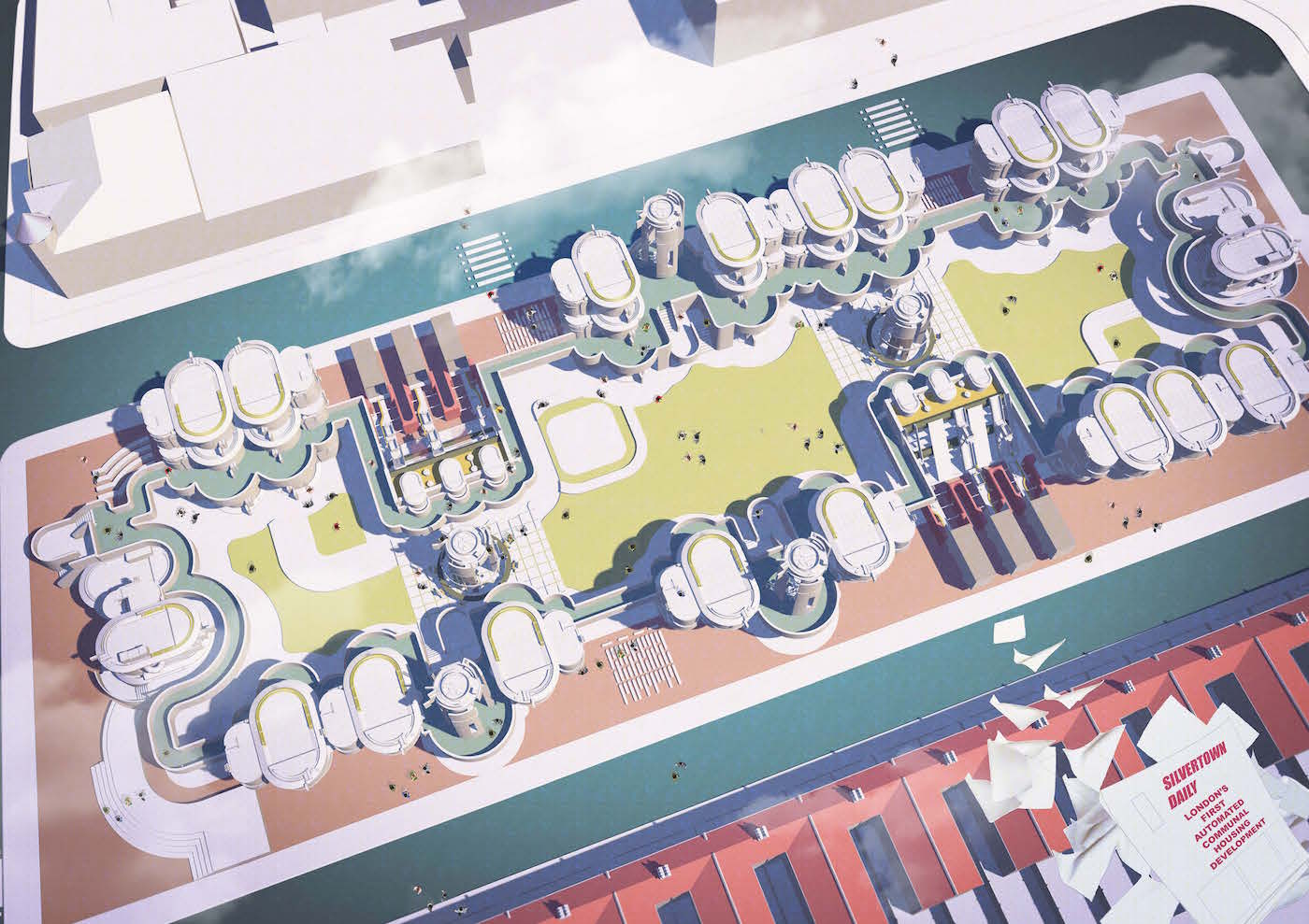 “Spaces are not gender neutral,” Quah told Dezeen. “Silvertown Plug-in” begins with statistics: On average, women (still) carry out 60% more unpaid work than men. “Even an efficiency expert would be staggered by the amount of chasing around … that the little woman takes as a matter of course,” says a male voice, a disembodied ghost from 1950s television advertisements. He compares a woman running up the stairs, carrying laundry, to a climbing vine; her jaunt would leave a “mountaineer gasping for breath.” Enter “Silvertown Plug-In”: In the project’s description, Quah explains that, “capitalizing on the untapped £1.1 trillion value of domestic labour to the UK economy, the masterplan is a communal housing scheme that performs housework. As a critique of the relationship between technology and architecture, everyday kitchen products become an architectural language.”