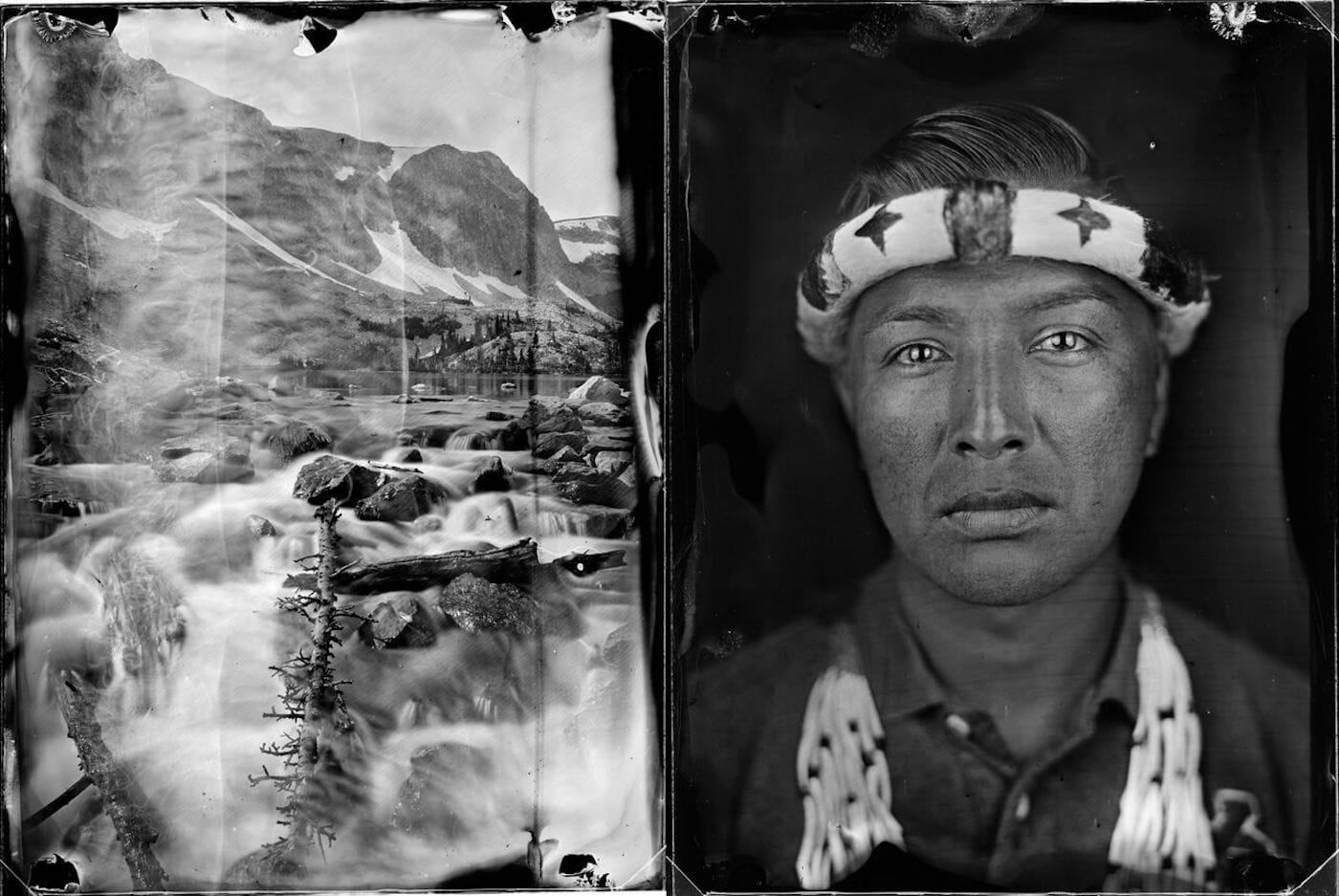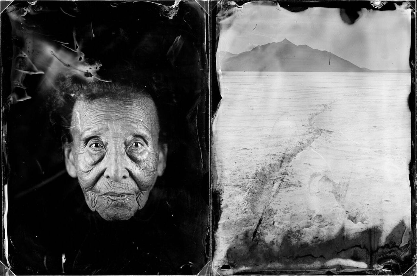 Accordingly, Lines and Lineage attempts to right the historical record through a series of diptychs that juxtapose portraiture and landscape photography meant to tie person with place. Photographing the descendants of families who lives on the once-Mexican territory, Van Houtryve proves their existence within a dominant narrative that often ignores them. Using traditional nineteenth century photographic techniques, like wet plate glass negatives, the artist taps into the aesthetic of the 1800s. These subjects appear in a various states of dress: some wear contemporary clothing, some wear Indigenous accessories, and others wear cowboy hats. The variety on display matches the variety of landscapes within the series, which expose the sheer scope of the United States’ acquisition from the Arkansas River to the Pacific Ocean, from the Bonneville Salt Flats to Medicine Bow Peak.