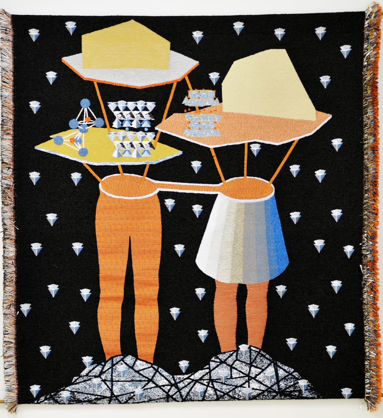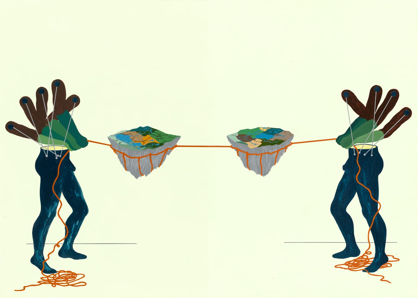 Throughout the tapestries and works on paper, figures appear dismembered and limbless, perhaps industrialized as tools of production and environmental exploitation themselves, but also bloodied and handicapped by the fracturing of the earth on which they stand. The artist goes beyond recycling, delving into the poetry of the earth and of our bodies existing as part of the fabric of nature.