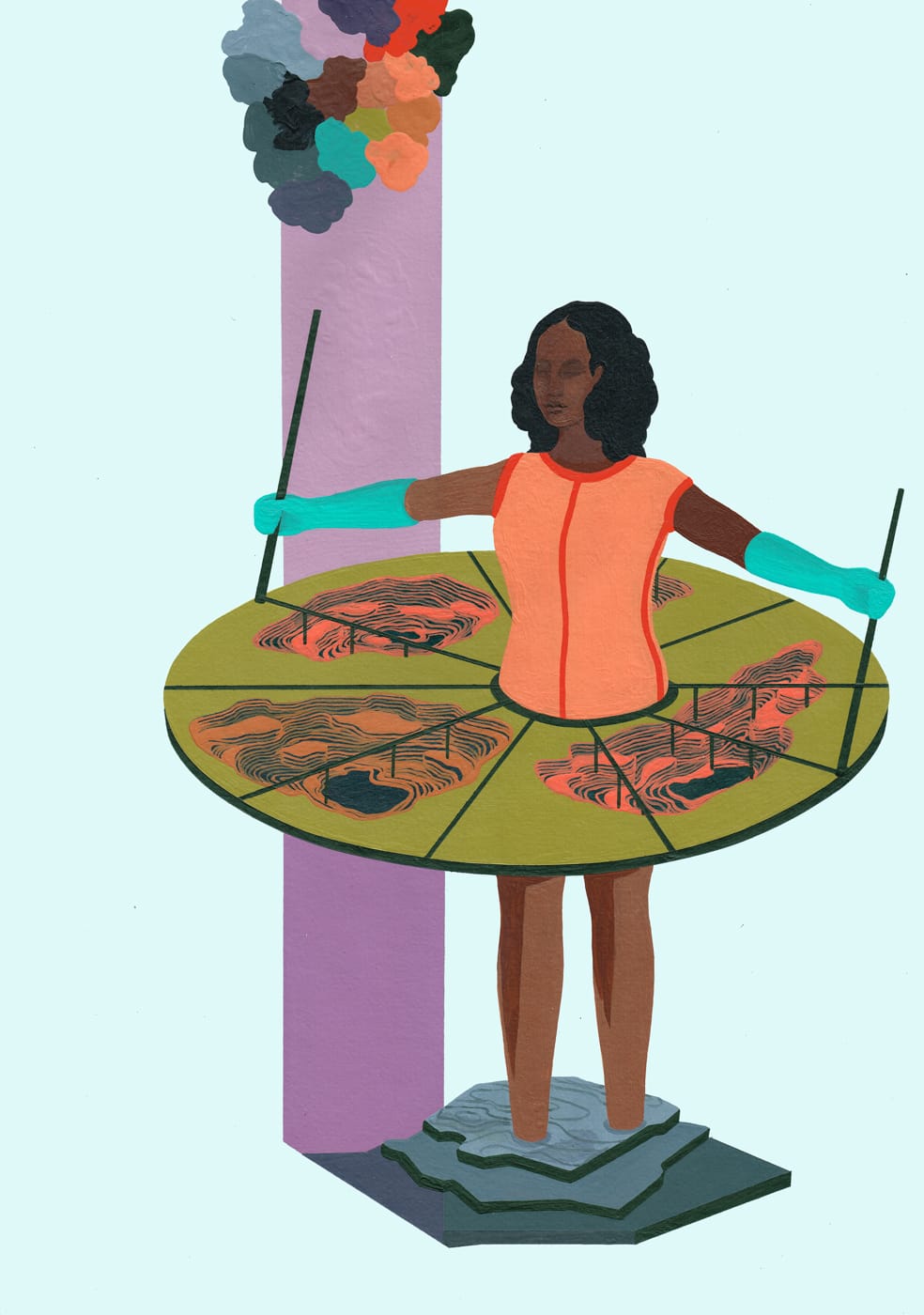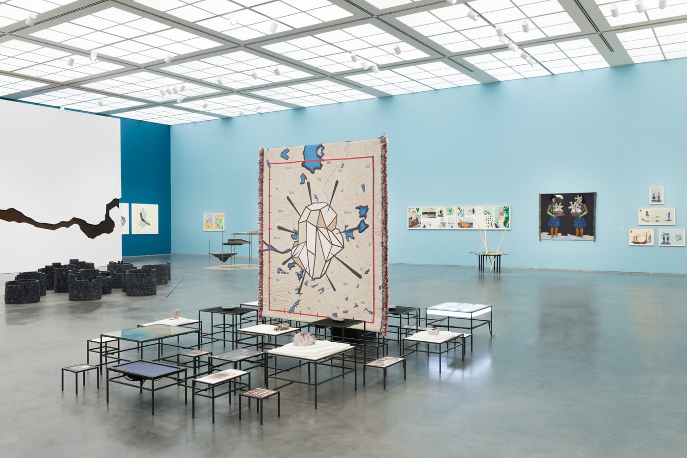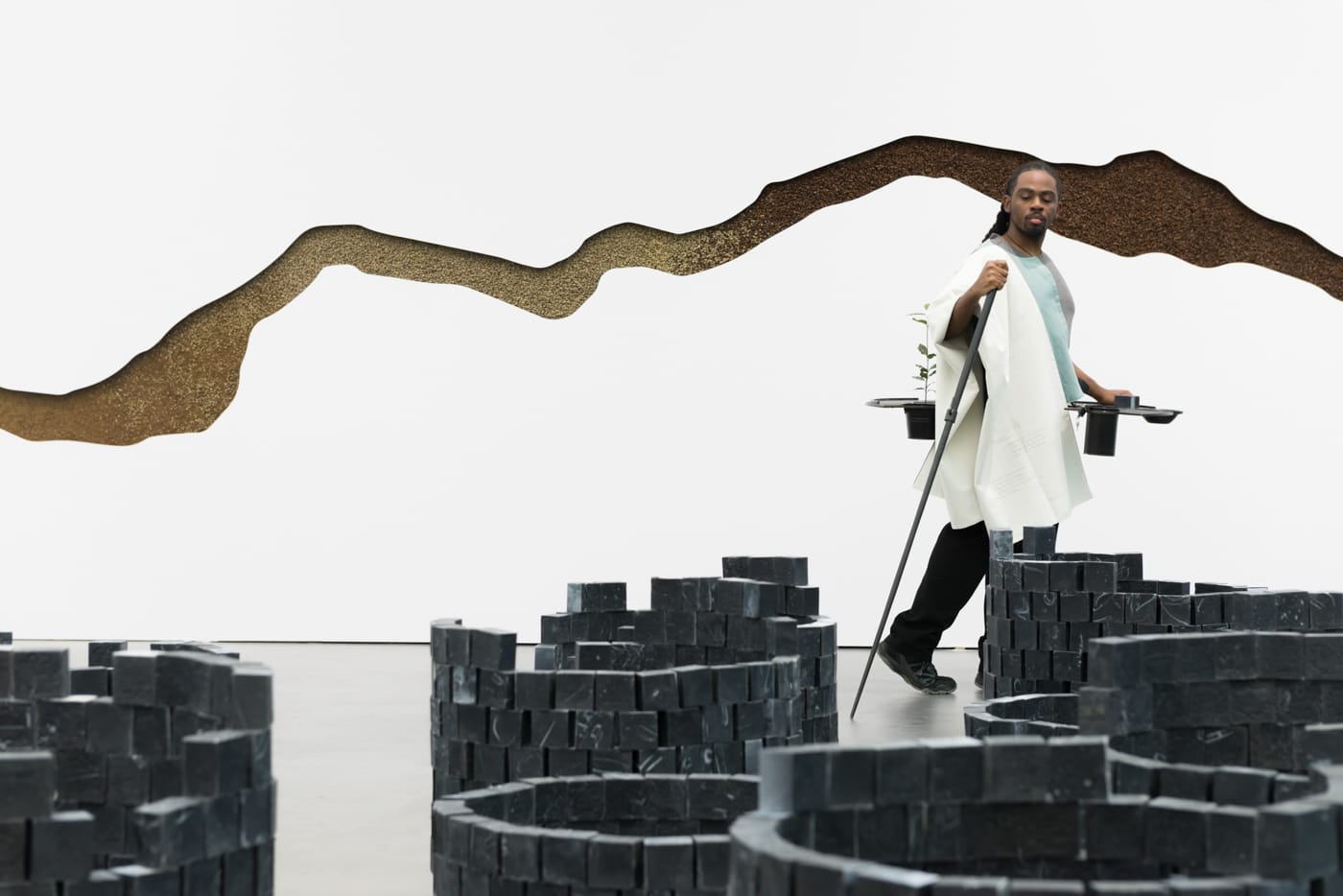 She created the Carved to Flow Foundation headquartered in Akwa Ibom, Nigeria, which will receive “support for researching material cultures and fostering shared experimentation and exchange locally” with the profits from the sales generated by the project, according to the project’s website. Initially for documenta 14, and now at Chicago’s MCA, costumed performers sell black bars of soap called “08 Black Stone.” The costumes serve as a “a shop founded on the body,” says the artist. Performers literally wear the symbolic shop, which is a garment designed with tiered platforms where the soap is displayed. The soap is made with charcoal and oils from the Mediterranean, the Middle East, and Africa, and it’s displayed at the museum in black towers reminiscent of the mineral piles and paintings elsewhere in the exhibition. The soap shop and factory were designed as self-sustainable, constructive ongoing artworks.