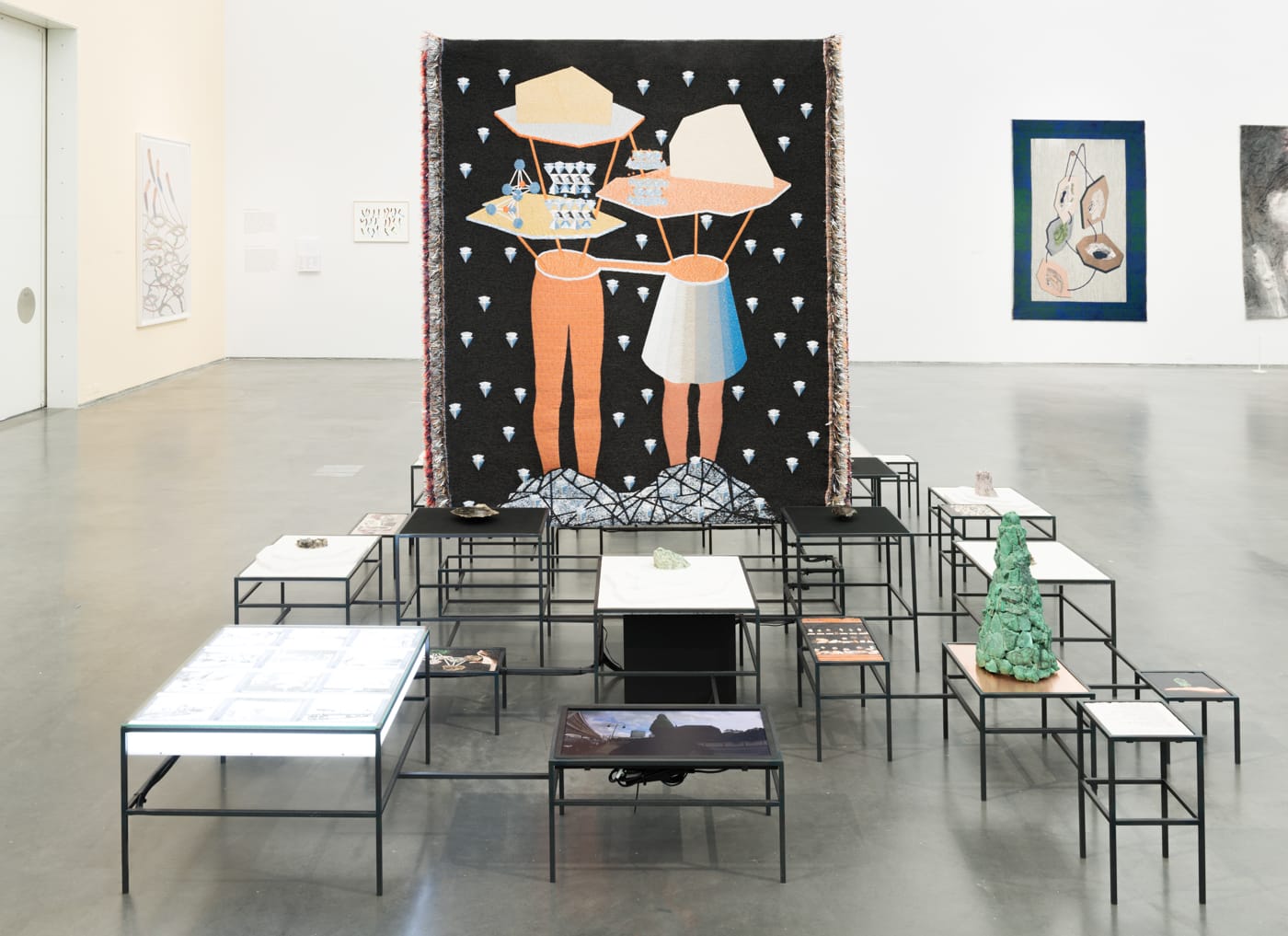 Her multi-part installation, “In Pursuit of Bling,” (2014-2016) occupies a large section of the floor in the MCA’s biggest gallery with tapestries, a light box, minerals, video, and other elements making up the whole. One of the elements is a video called “Reflections of the Raw Green Crown,” (2015) in which the artist performs for the camera in front of copper-domed churches in Berlin wearing a raw copper hat. She becomes the voice of the mineral that was mined in Africa until entire habitats were decimated — the steep cost of European industry and economic growth thanks to colonialism.