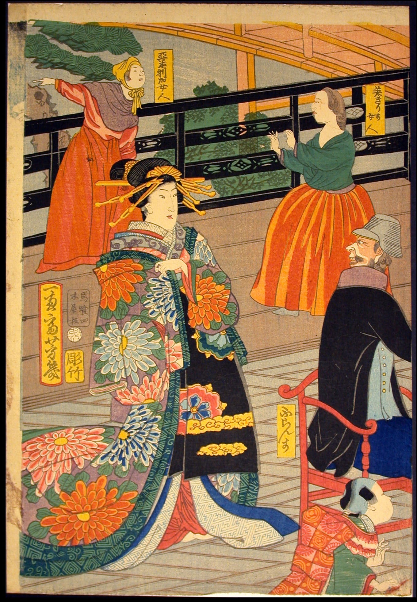 Despite some notes of apprehension, the dominant tone of the depictions of the West is one of openness and hope for mutual enrichment through commercial and cultural interchange: an incipient globalism. Those who can read the Japanese text on the woodblock prints will find phrases such as “a picture of prosperity” or “California is a port whose many ships come and go all over the world. It is said that the people acquired great knowledge through exchange.” The dream seems to be one of meeting the West on equal terms. In Utagawa Sadahide’s “True View of a Yokohama Merchant House” (1861), for example, an American woman and child happily play shuttlecock with a Japanese woman while a top-hatted American businessman negotiates with his Japanese counterpart in the background; and in the same artist’s “An American Mercantile Building in Yokohama” (1861) an American woman plucks a violin laid across her lap in emulation of a nearby Japanese woman with a shamisen.