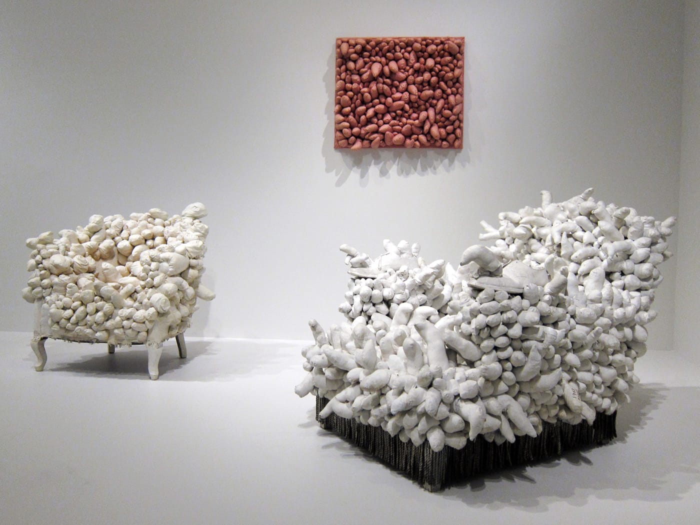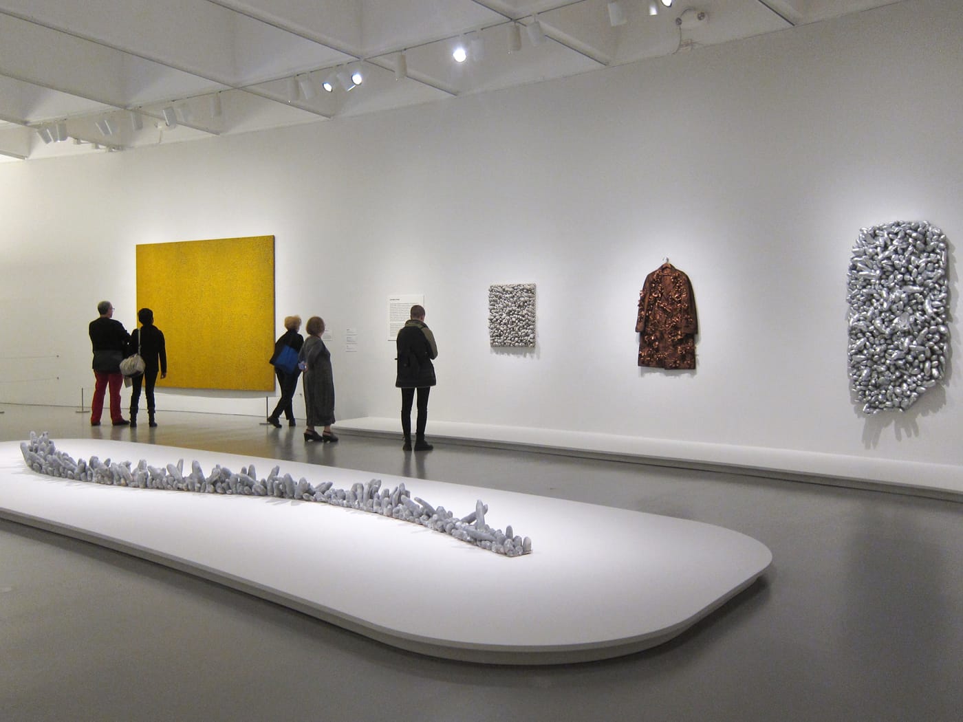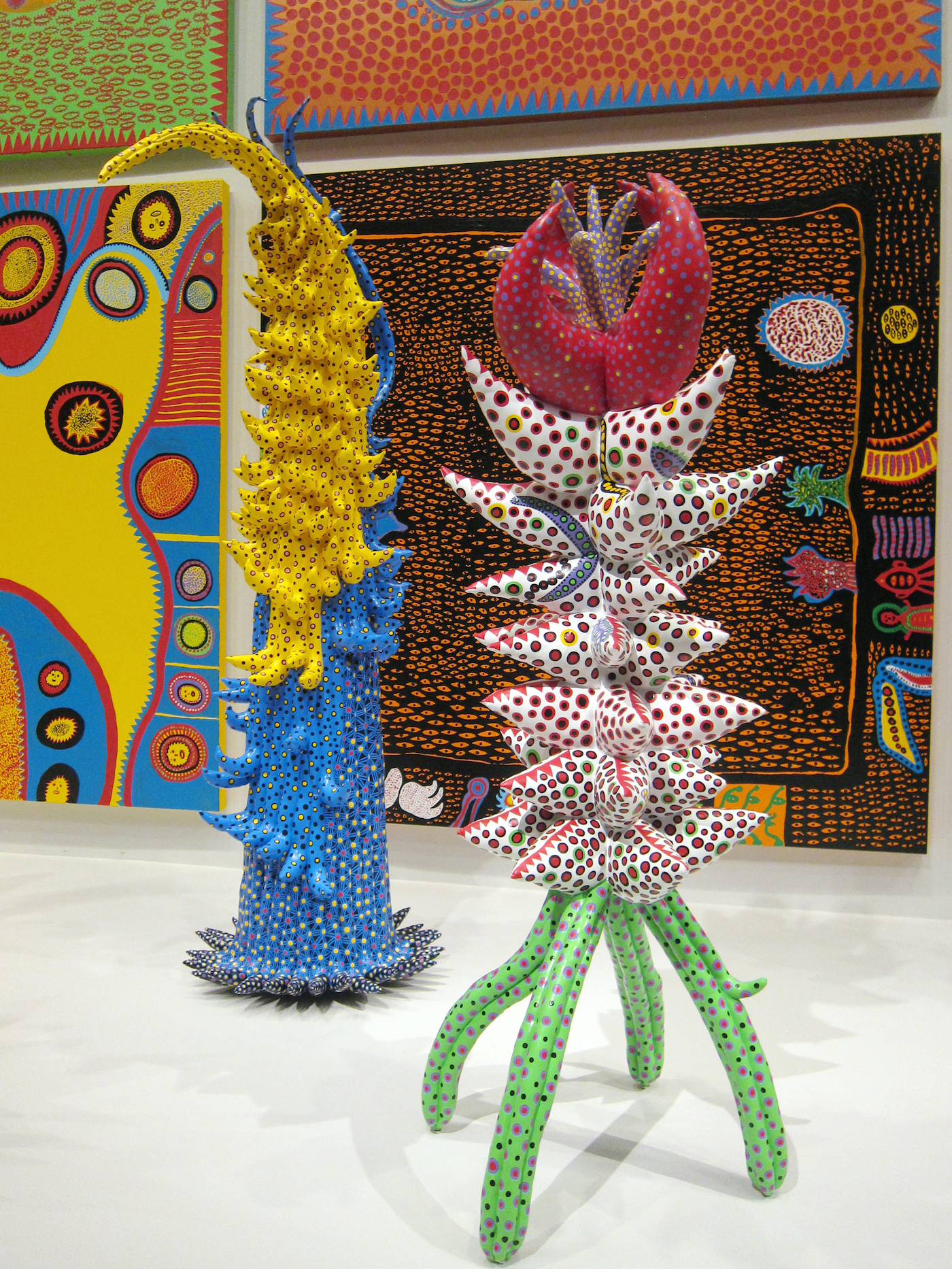 But “The Obliteration Room” is just fun, namely because it grants an opportunity to immerse yourself entirely in Kusama’s eccentric world. Her mirror rooms, though transportive, offer limited experiences — you can’t walk further than a few feet in each — and you can’t touch anything, of course. Many of her sculptures unfortunately shed some of their magic, staunchly established as objects in a museum as they perch on platforms, are set to the side, or stand behind rope. The yellow tentacles of “Life (Repetitive Vision”) (1998) could have appeared to break through the museum’s floor like an unruly cephalopod rather than served up like exotic calamari on a white platter. The eye-popping series My Eternal Soul is presented as if in a showroom, with sculptures standing in front of large paintings stacked one atop another.