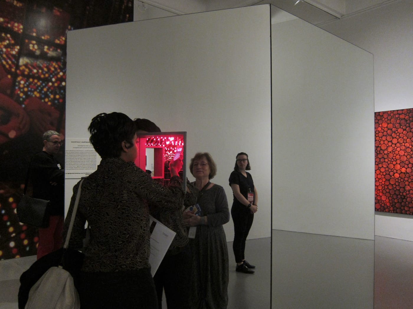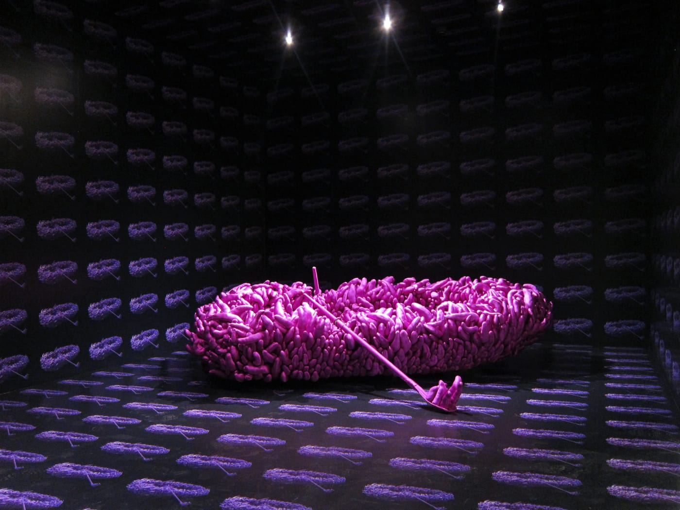 These are all intricate, vibrant works that when grouped together, distract from individual appreciation. Reminiscent of carnivorous plants with alluring spines and bulbous forms, the sculptures deserve to be seen in the round. I imagine them planted across the gallery to create a delightfully grotesque garden of metal and stuffed cotton— but of course, much of this space is designed to accommodate crowds. Yoshitake told me she would have liked to do away with the platforms, but the dangers of the blockbuster exhibition are simply too great. It’s a pity these obstructions are unavoidable. Thirty seconds is far too short to find an inner tranquility, but these spiny forms don’t fail to endlessly mesmerize even in their separate corral. They make plain that one does not need mirrors to generate worlds unbounded.