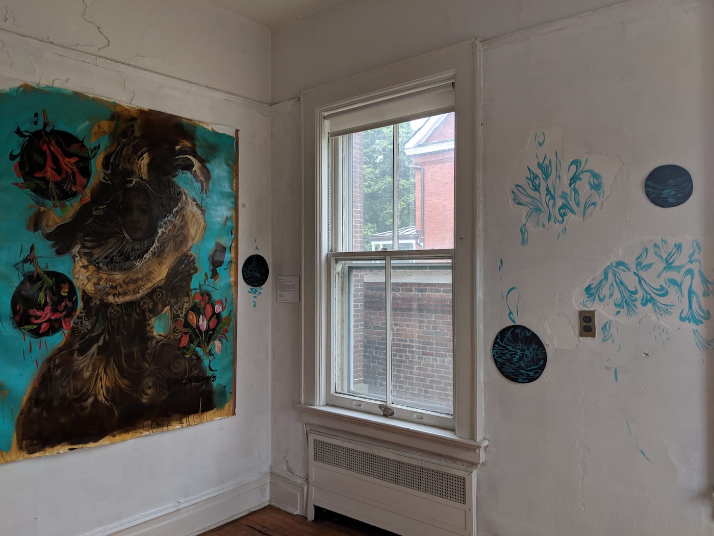 Standouts in Early Encounters include Jorge Luis Rodriguez’s “The Missing,” which wraps a sunny upstairs room with corrugated panels, each painted with a figure that sinks mysteriously into abstract motifs. Referencing souls who left no mark on history other than the space they once occupied, the room is transformed into a memorial of the insignificant who passed through the nation’s harbors. Scherezade Garcia’s unstretched paintings are based on Baroque portraiture, though revised with swarthy complexions and and floral designs based on both Dutch and native New York species. Similar floral notes were also painted into several patches of wall exposed by fallen plaster.