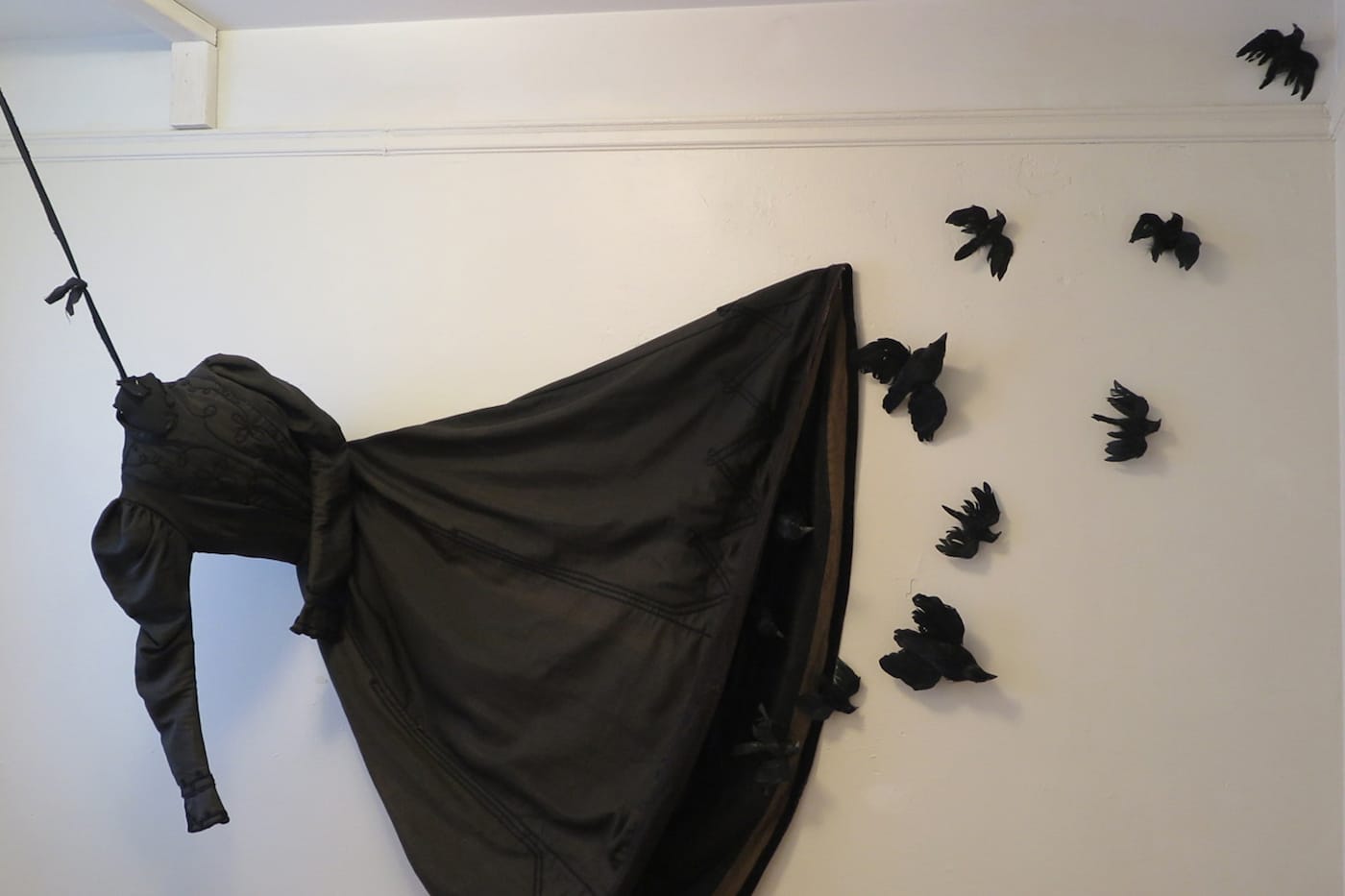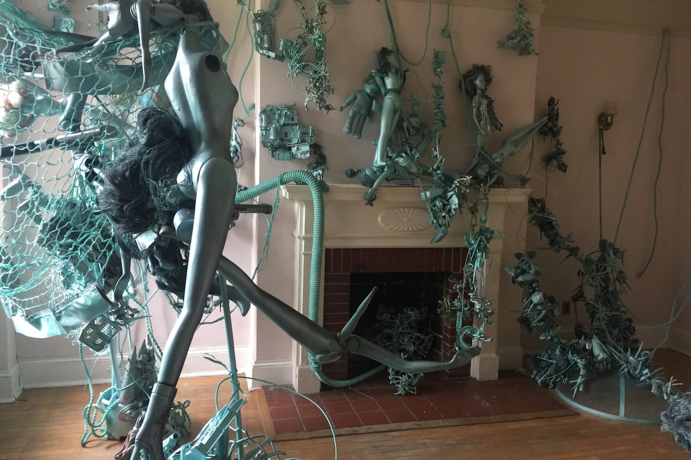 In Island Universe the work was created and installed with considerable overlap. The walls along the stairs to the second floor are painted by Dasha Zibrorva, with a garden mural featuring plants that look back at you. Above your head fly Ed Herman’s “Street Kids” catching your attention at approximately the same moment you become aware of sunlight reflected off the water and onto the walls of a corridor — an illusion Irina Danilova and Hiram Levy created with little more than mylar, a small lamp, and a tiny electric fan. Both Margaret Roleke and Alyson Pou each made use of a full room. Roleke’s “Sea Green Mist” crisscrosses her space with strings of plastic toys and debris that are both whimsical and attentive to the issue of trash carried on the outgoing tide, while Pou’s “Island Flight” utilizes an antique 19th-century frock in an installation of small, sculptural birds, some of which sit on wigs as if they were nests. Its domestic and maternal references to the room’s actual history is an exception to the show’s expanded thematic scope.