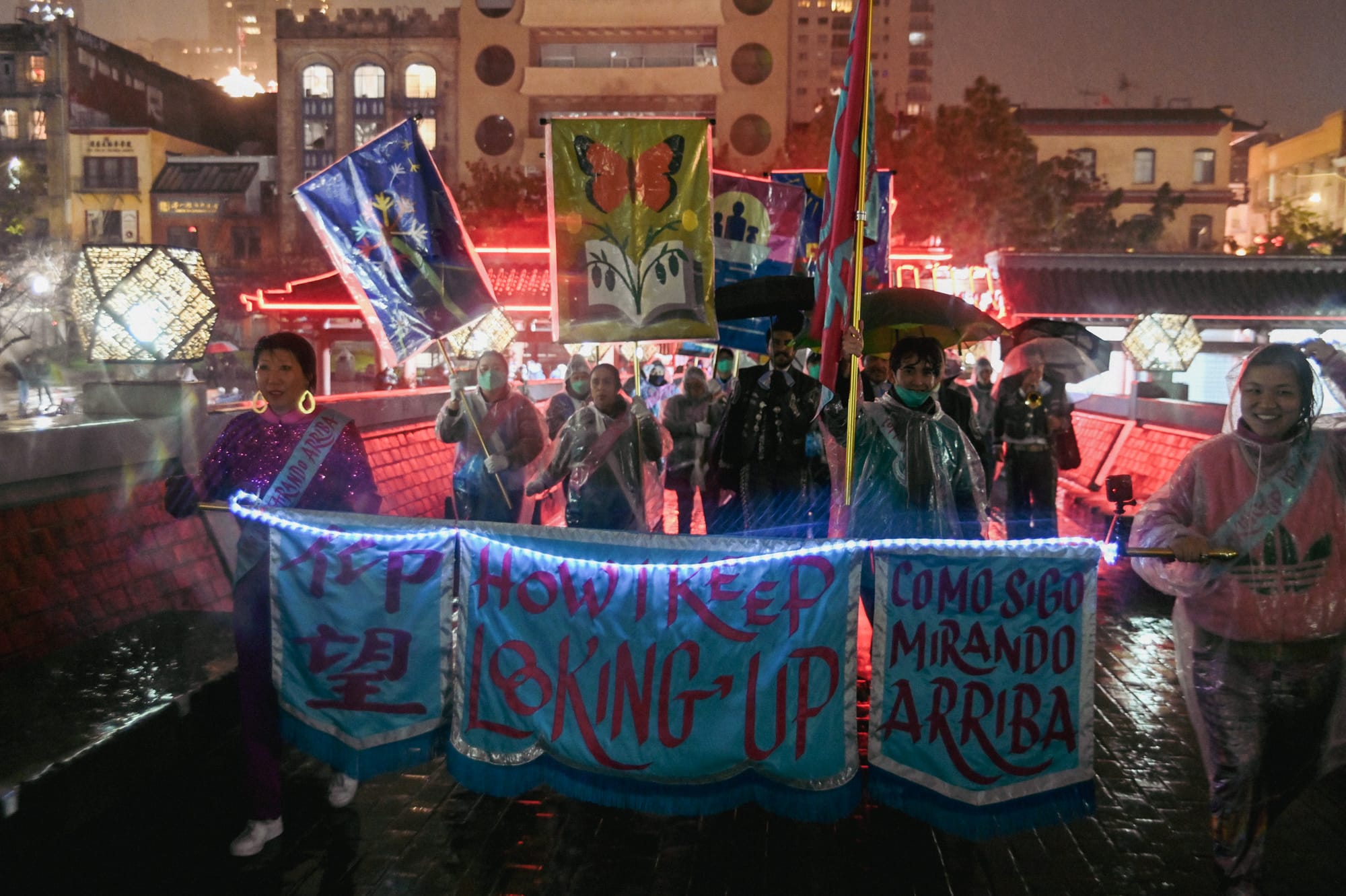 After the parade celebrating the Year of the Rabbit, the women followed a mariachi band into the banquet room of the Chinese Culture Center (CCC), a collaborator on the project How I Keep Looking Up/Como Sigo Mirando Hacia Arriba/仰望. Donning rain ponchos and proudly holding up their flags, they were greeted with cheers and applause. Artist Christine Wong Yap, slightly damp in the pink sequin top she had worn to march in, stood with them. Yap conceived of How I Keep Looking Up a year ago, holding workshops in Spanish, English, and Chinese as well as one-on-one meetings with the women for the last six months.