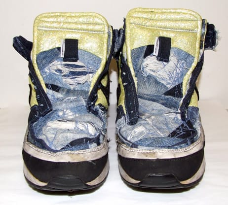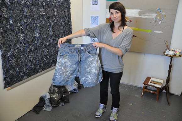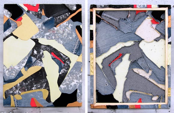 Lately, I’ve been staring a lot at men’s crotches. But not for the reason you’re probably thinking. I’ve been on a hunt for people who wear their jeans until they are completely un-wearable. This hunt has led me to construction workers, squatter punks, and hipsters, all of which so far are men. I’ve been saving these masterpieces from the trash heap by collecting them from their makers and am stitching them into patchwork wall hangings or meshing them with icons of popular culture. Which brings me back to the crotch staring. This process involves some serious assessment, as I have to make sure the weathering is authentic, not factory made.
