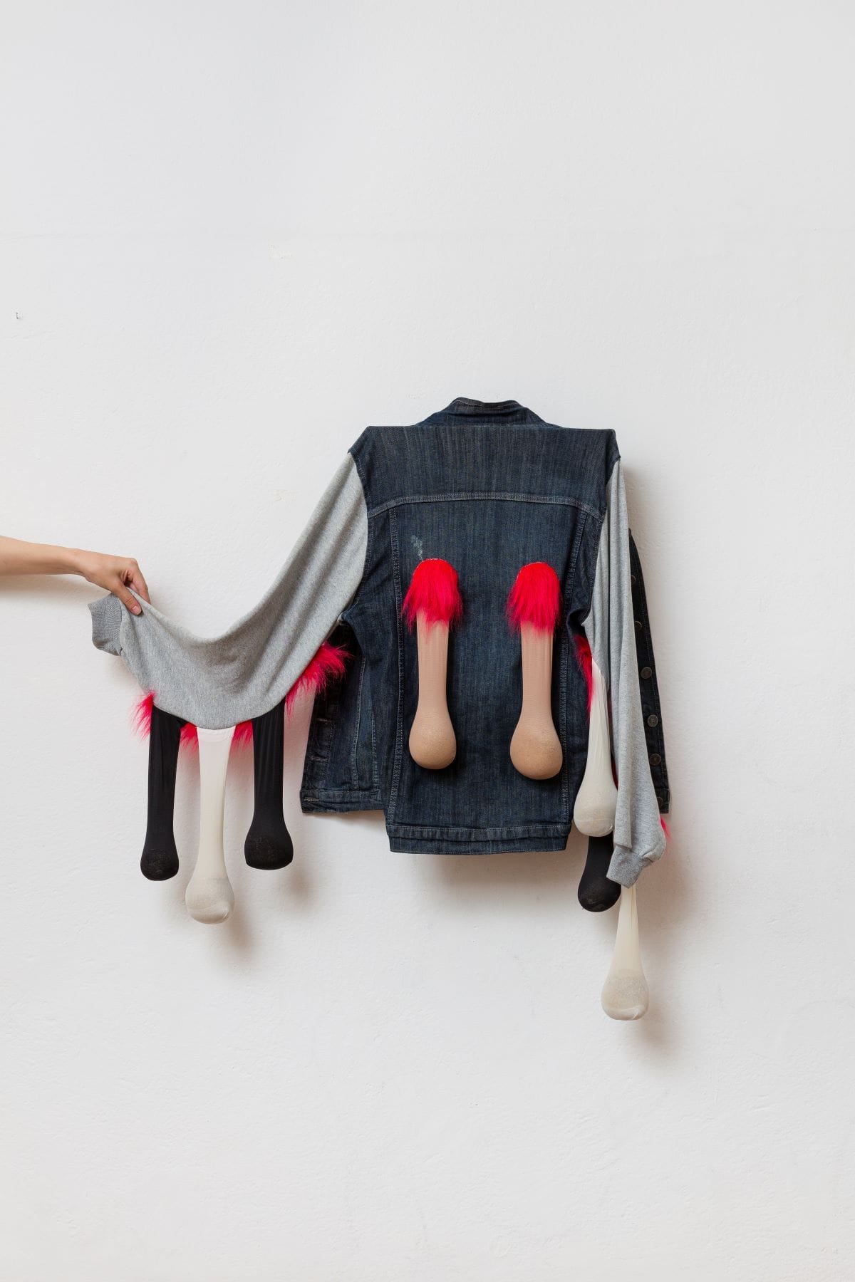 On the edge of Zona Maco’s giant maze of glitzy art galleries, were two smaller gems: the Ejes and Sur sections. Ejes, curated by Direlia Lazo, set out to champion newer artists within Mexico’s robust cultural ecosystem by exploring the human body. There was a lot to choose from but Xavier Schipani’s gray figurative curved paintings of a trans body in flux at Big Medium were a serene class-act. I was also impressed with Samara Paiva’s soft nudes of calm, wispy Black bodies at HOA Galeria. This year, the Sur section was stretching the limits of “feminine” and the “global south,” curator Luiza Teixeira de Freitas told Hyperallergic. In a stellar joint booth by Quadra and Marli Matsumoto Arte Contemporânea, the clay body canvases of Carla Santana, a young Afro-Brazilian activist, were shown facing soft colorful textile sculptures by Élle de Bernardini, a transexual dancer, also from Brazil. Both sections did somewhat blur the lines of what counts as new, gender fluid, and local in the Americas today.