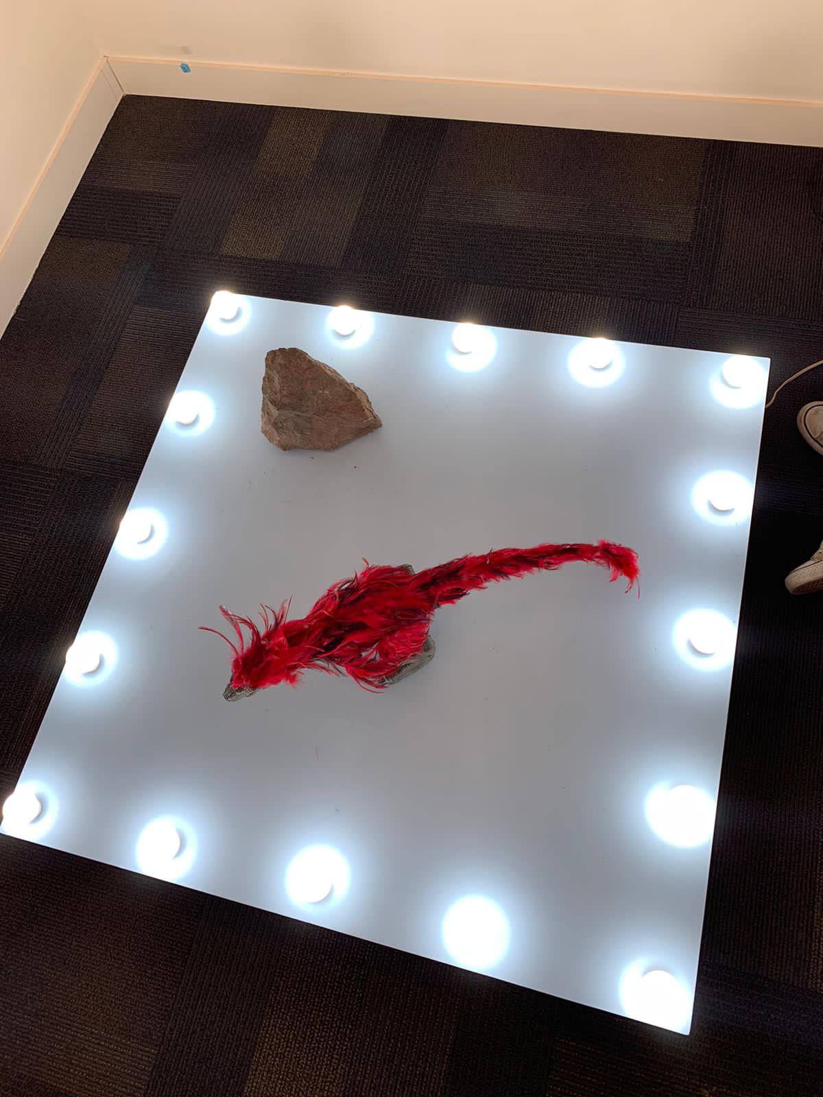 Feria Material was even more provocative, especially in two sections: Proyectos and IMMATERIAL. Brett Schultz, the fair’s co-founder, told Hyperallergic that Proyectos is "building the next generation of artists and curators in Mexico." Exhibitors get free booths, mentorship, and training over two years. Salon Silicon’s “Go-Go Raptor” (2022) by Romeo Gómez López was brilliant — a feathered toy dinosaur prancing on a lit stage to Reggaeton around a robust “hetero” stone while queering masculinity. Also noteworthy was marcelaygina’s “Kitty combo superstar (jumping arracheras)” (1999), an iPad screening of two young skinny Mexican women in frilly ballet outfits trampolining on a springy cot at La Cresta, and mocking the idea of performance.