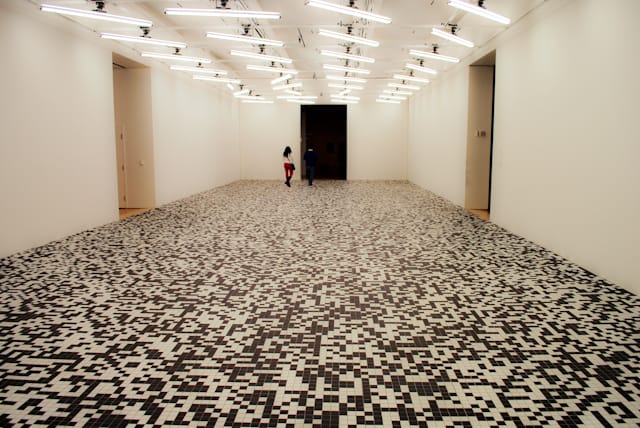 Tauba Auerbach is an artist who can do no wrong by me. Her giant floor-tile installation is currently part of the exhibition Field Conditions, and is coupled with a kinetic light installation by Rafael Lozano-Hemmer. “50/50 Floor” is made of 50% black tiles and 50% white tiles, which are randomly distributed over the floor in a QR code–like pattern. Auerbach’s work often deals with generative systems, and the aesthetics of this floor are determined by a nearly impossible to achieve mathematical idea of randomness, all the while feeling perfectly balanced.
