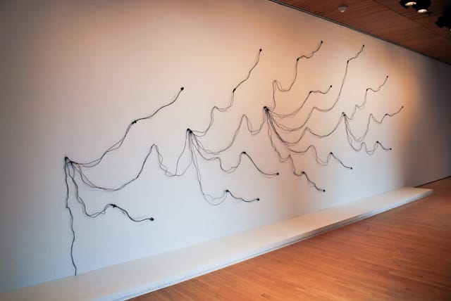 Recalling work I covered earlier by the artist Zimoun, Obsorn’s installation “Night-Sea Music” (1998) is a lighthearted, interactive kinetic and sound installation. Reading as an erratic spider web of electrical cords upon first glance, this installation springs to life when a visitor pushes a button. The cords begin to wind in on themselves, creating coils until they snap straight again, a process that slowly has scuffed up the wall around them. The wires are attached to musical boxes playing “The Merry Widow,” and the entire piece is apparently representing the short and often tragic life of a couple of spermatozoon. I wouldn’t have guessed that until I read the description, but I enjoyed it much more after I had.